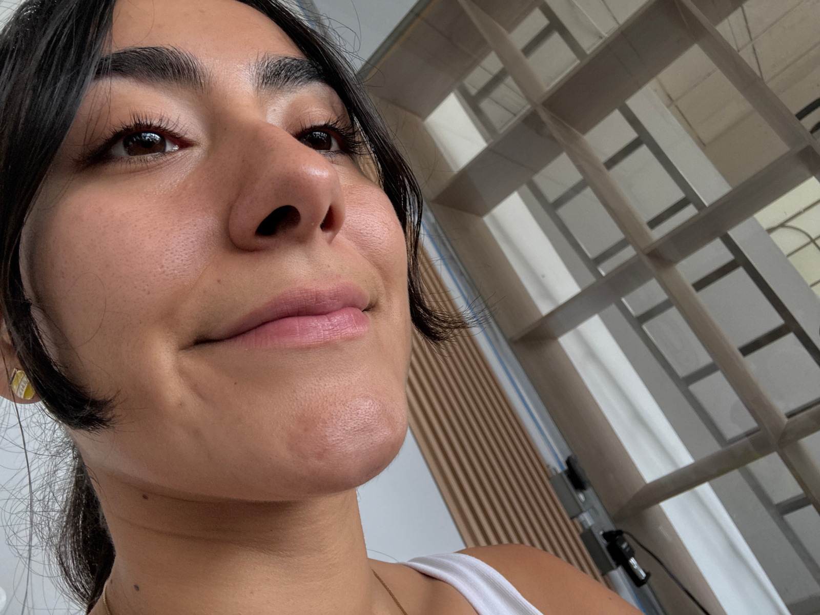 A low-angle, close-up captures a woman's face. She has dark hair, thick eyebrows, and brown eyes. Her skin tone is light brown. She has a slight smile. She is wearing a white tank top and a gold neckl…read more