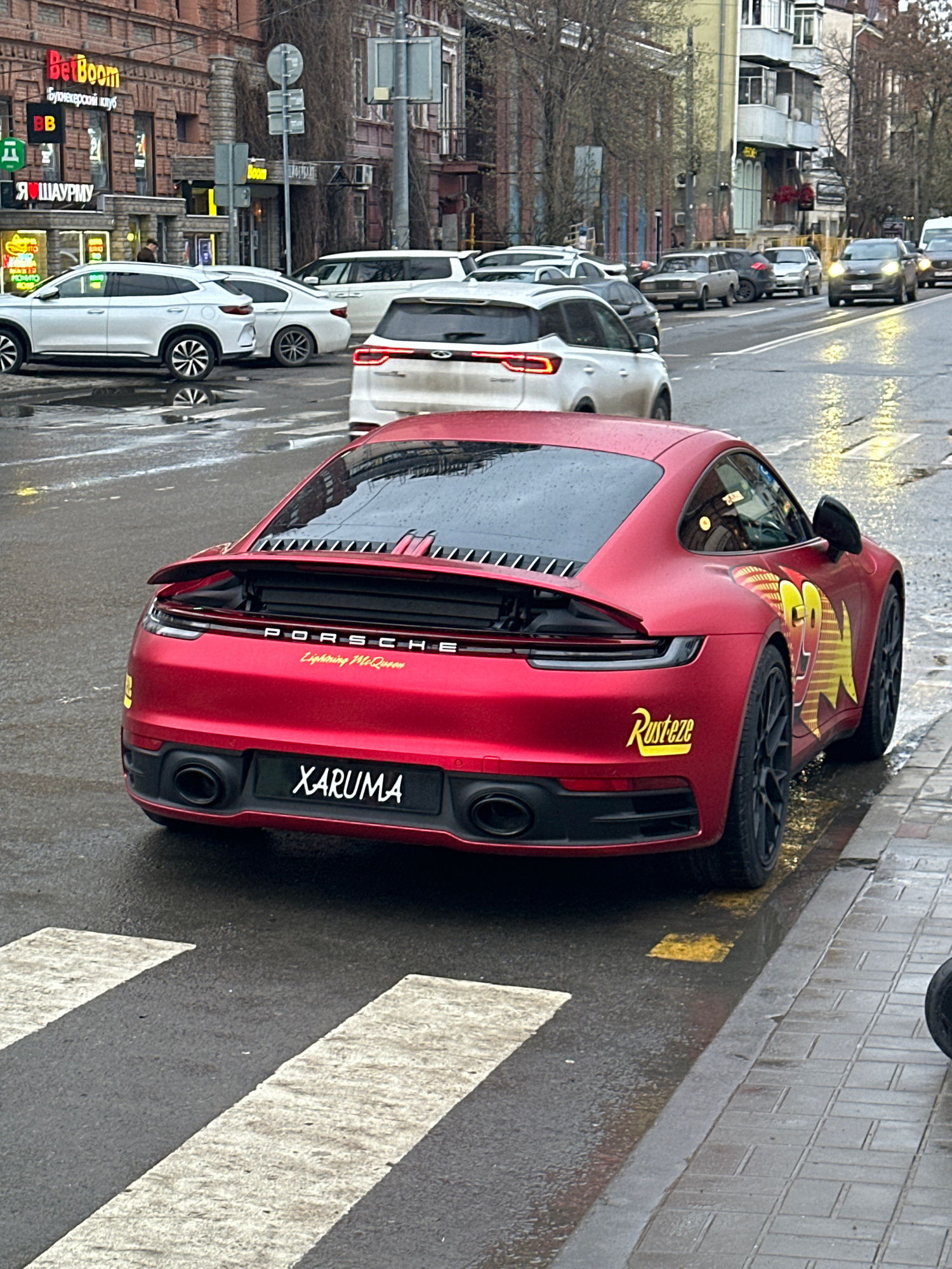 A red Porsche with "Rusteze" and "Lightning McQueen" markings is parked on a street in Rostov-on-Don, Russia. The license plate reads "XARUMA". The car is parked near a pedestrian crossing, with white…read more