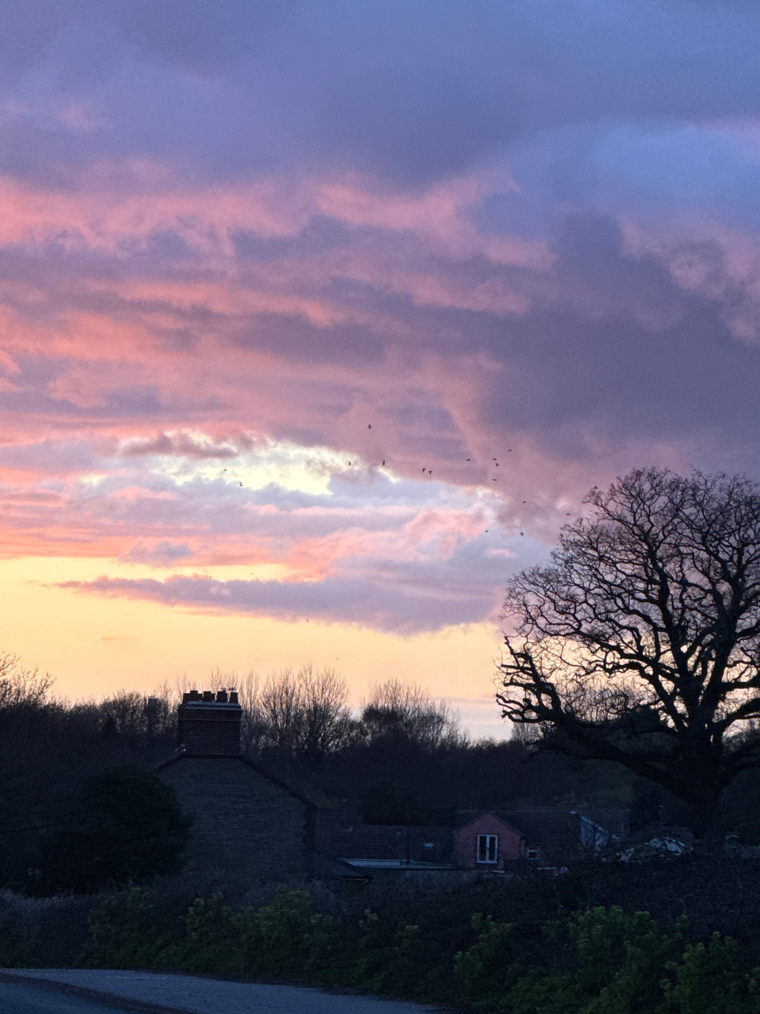 The image shows a landscape at dusk or dawn, with a sky dominated by vertical streaks of purple, pink, and pale orange clouds. A silhouette of a large tree with bare branches is located in the upper r…read more