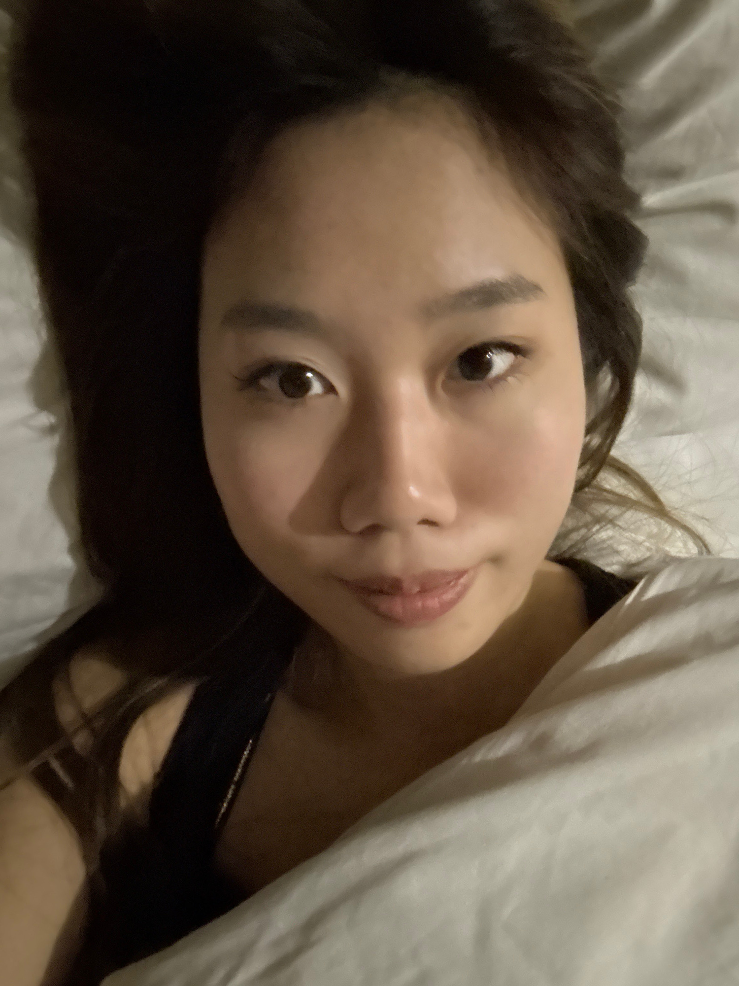 The image is a close-up selfie of an Asian woman lying in bed. She is partially covered by a white blanket. Her hair is dark brown and shoulder-length. She has a slight smile. The background appears t…read more