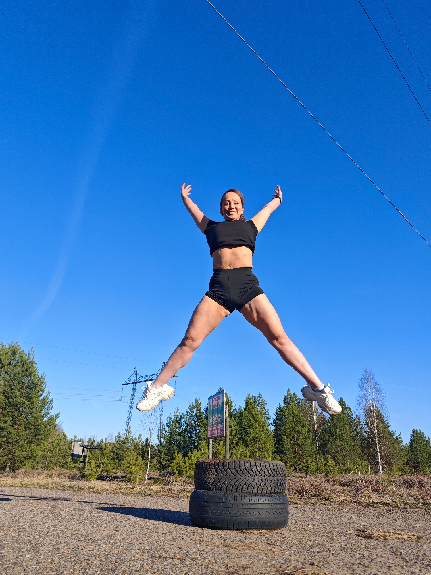 A woman is captured mid-air in a dynamic jump, set against a clear, vibrant blue sky on a sunny day. She appears to be in her 30s or 40s, with a cheerful expression, smiling broadly. She is dressed in…read more