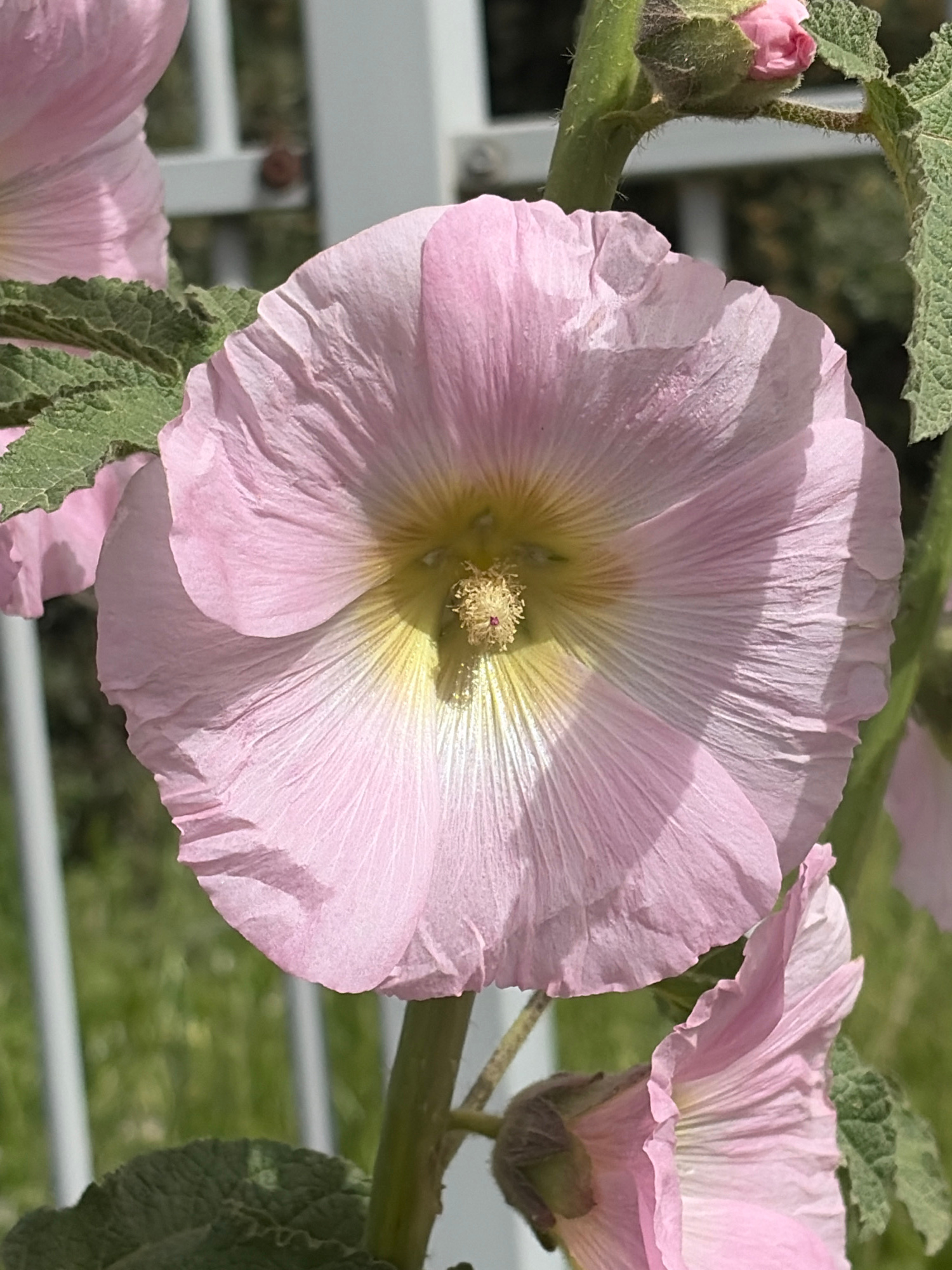 The image shows a close-up of a pink flower, likely a hollyhock, with a yellow center. Other pink flowers and green leaves are visible in the background. A white fence is partially visible behind the…read more