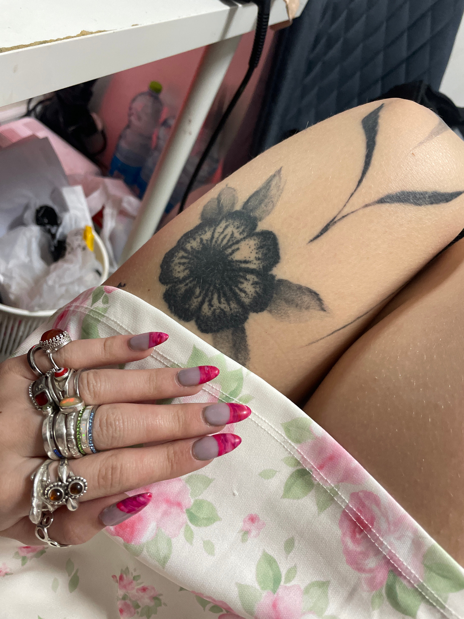An individual's thigh, tattooed with a floral design, is positioned next to a hand adorned with multiple rings and manicured nails with a red and gray design. The person is wearing a white fabric patt…read more