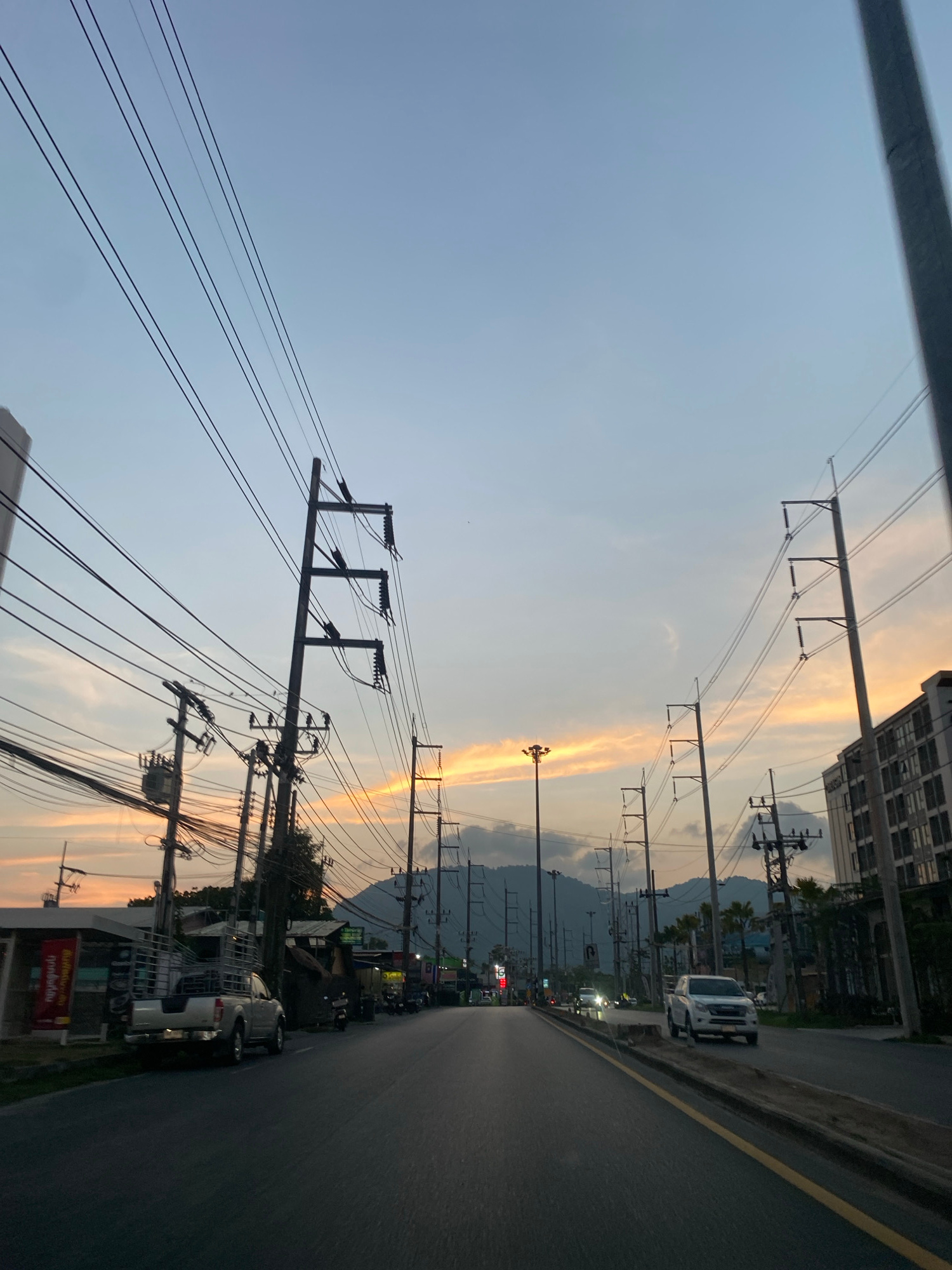 The image shows a street scene in Kathu, Thailand, at dusk. The view is along a paved road with a yellow dividing line, with buildings and parked cars on the right side of the road. A white van is vis…read more