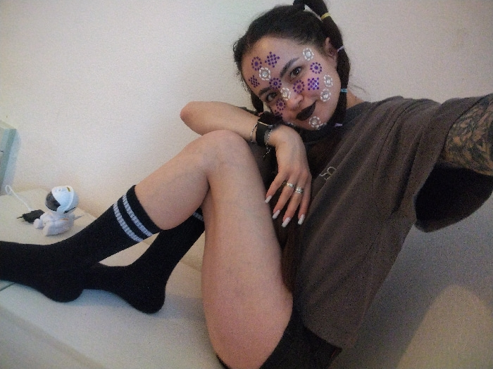 An indoor scene in the city of Noviy, Russia, displays a female subject seated or reclining against a plain, light-colored background. She directly faces the camera. Her dark hair is styled into two pβ¦read more