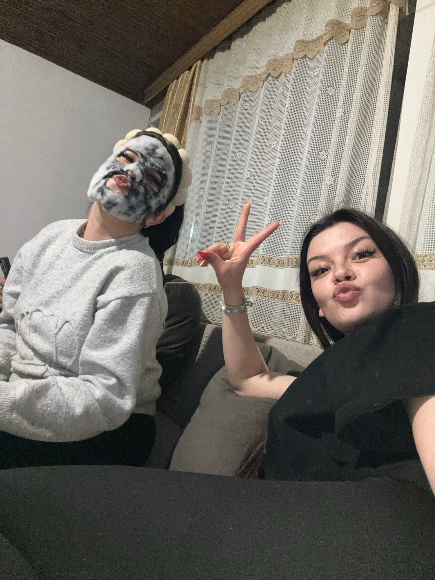 Two females are in a room in Chubra, Bulgaria. One is wearing a grey sweater and a foamy face mask. The other has dark hair and is wearing a black shirt. She is making a peace sign with her right hand…read more