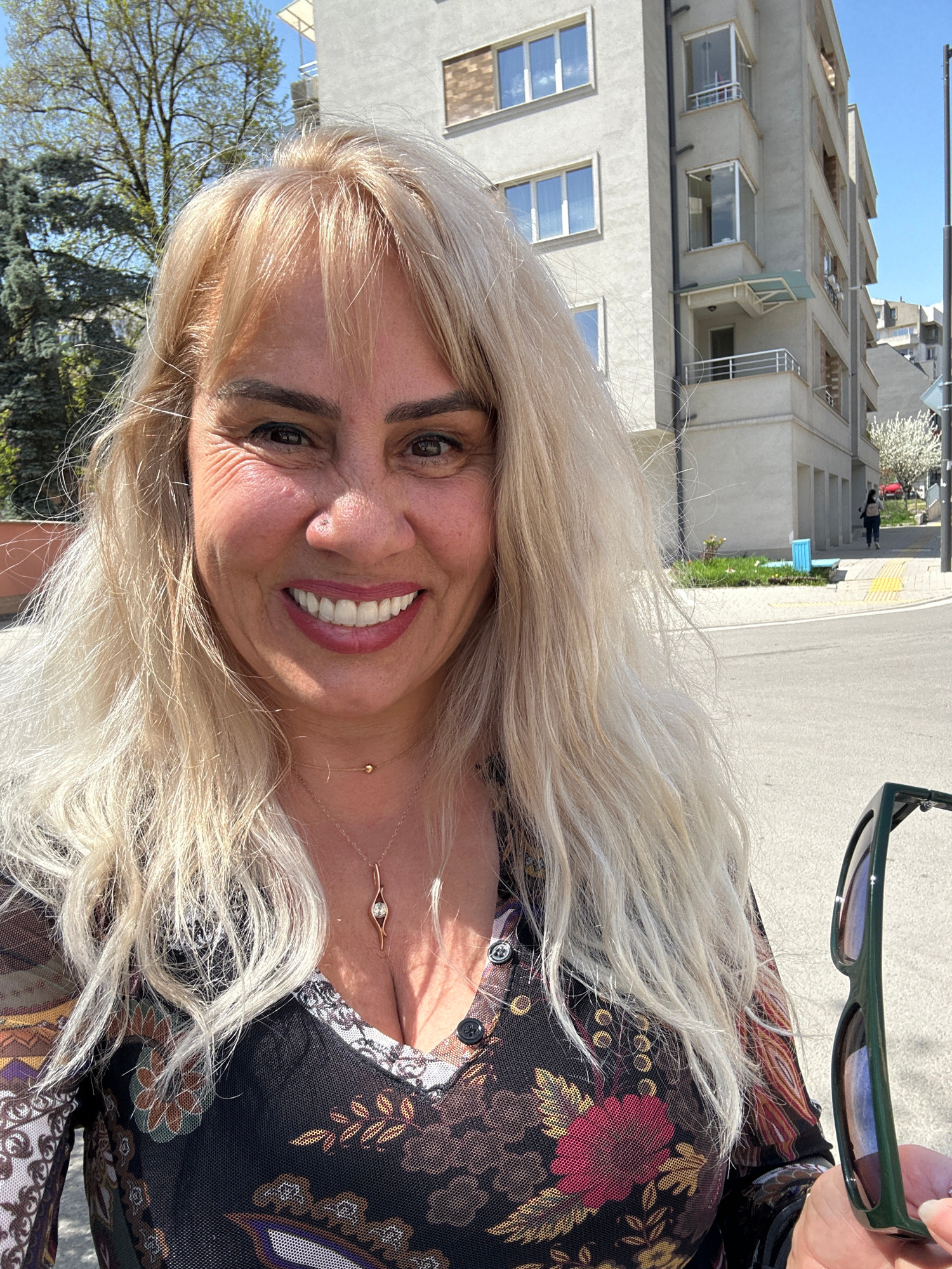 The image captures a selfie of a smiling woman outdoors on a bright, sunny day, likely taken in Sofia, Bulgaria. The woman, who appears to be in her 40s or 50s, has long, flowing blonde hair that casc…read more
