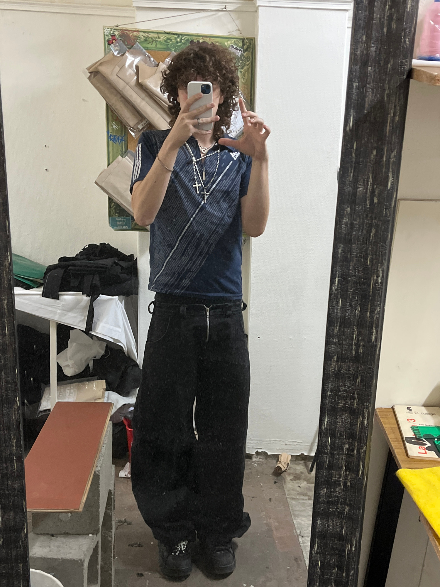 A person with curly brown hair is taking a selfie in a mirror. The person is wearing a blue patterned shirt, black pants, and black shoes. They are wearing a necklace with a cross pendant. The backgro…read more