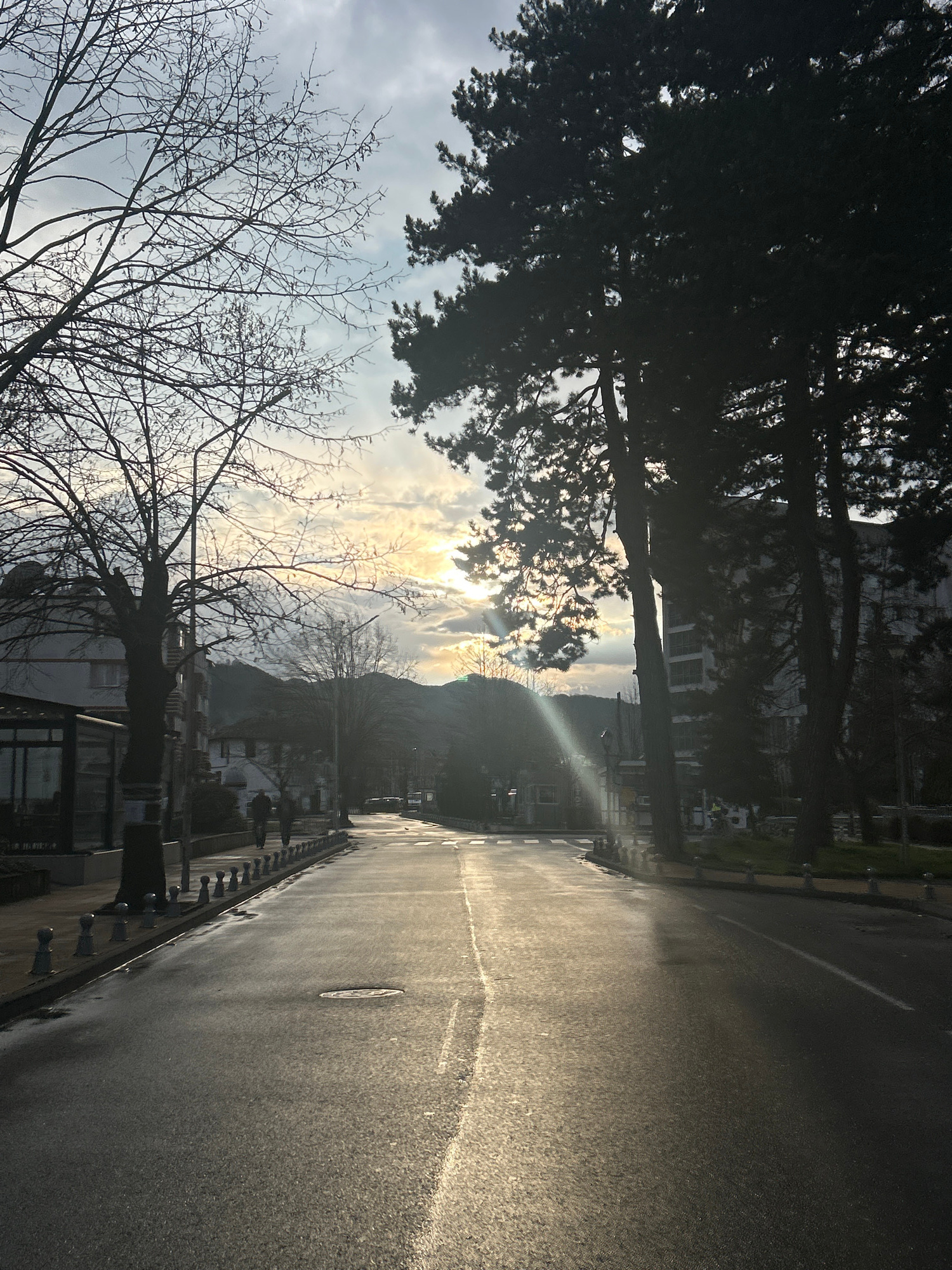 The image shows a street in Zlatograd, Bulgaria, taken at ground level, with a low angle of view. The street surface appears wet, reflecting sunlight. The left side of the image is dominated by silhou…read more