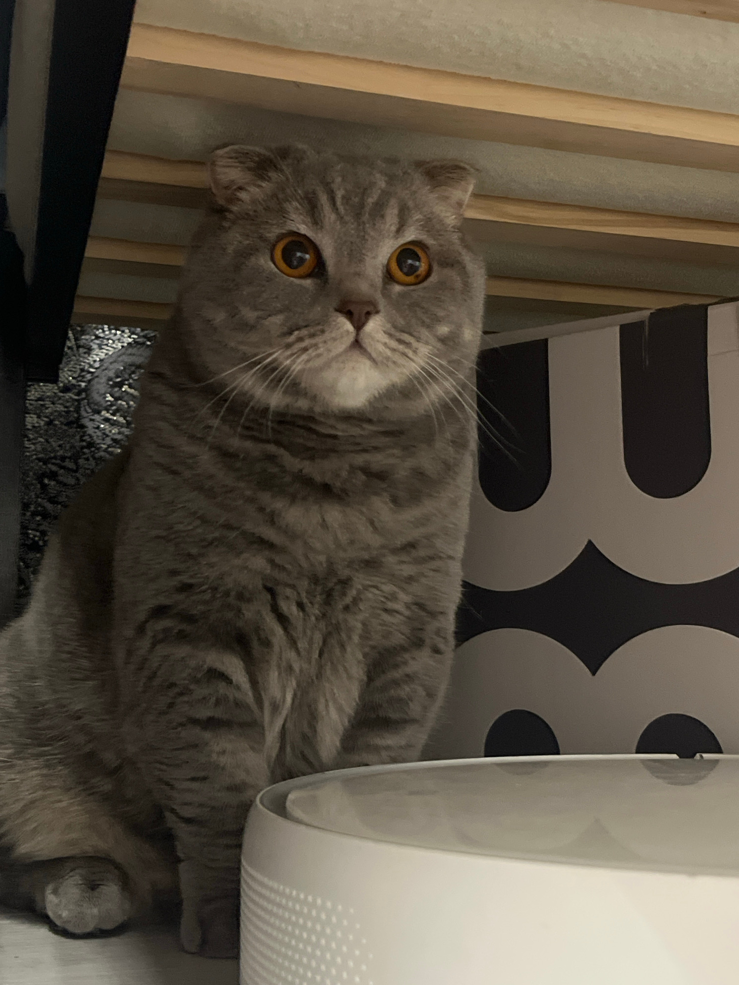 A gray Scottish Fold cat lies on a gray surface with a black and white "38" graphic behind it. The cat's face is oriented towards the camera, displaying its amber eyes and gray fur. To the cat's right…read more