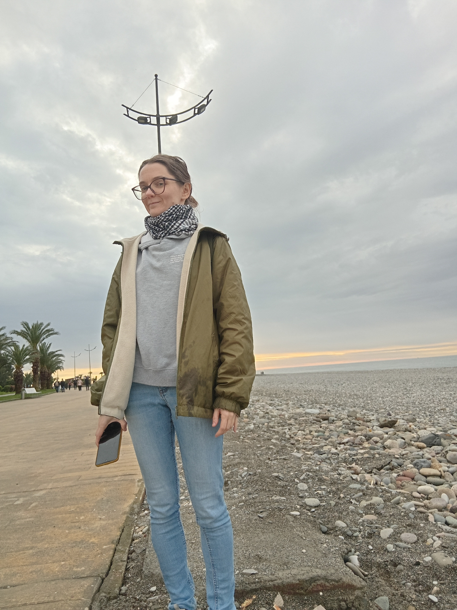 A person stands on a concrete promenade near a pebble beach in Batumi, Georgia. The person is wearing glasses, a gray sweatshirt, a green jacket, and blue jeans. They are holding a phone. The sky is o…read more