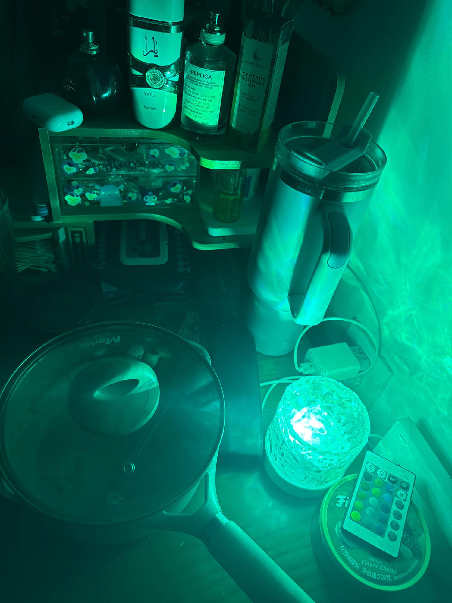 The image depicts a cluttered shelf or storage area under a green light. On the left, there's a wooden shelf with bottles of perfume and beauty products, including bottles labeled "REPLICA," "YARA Lat…read more
