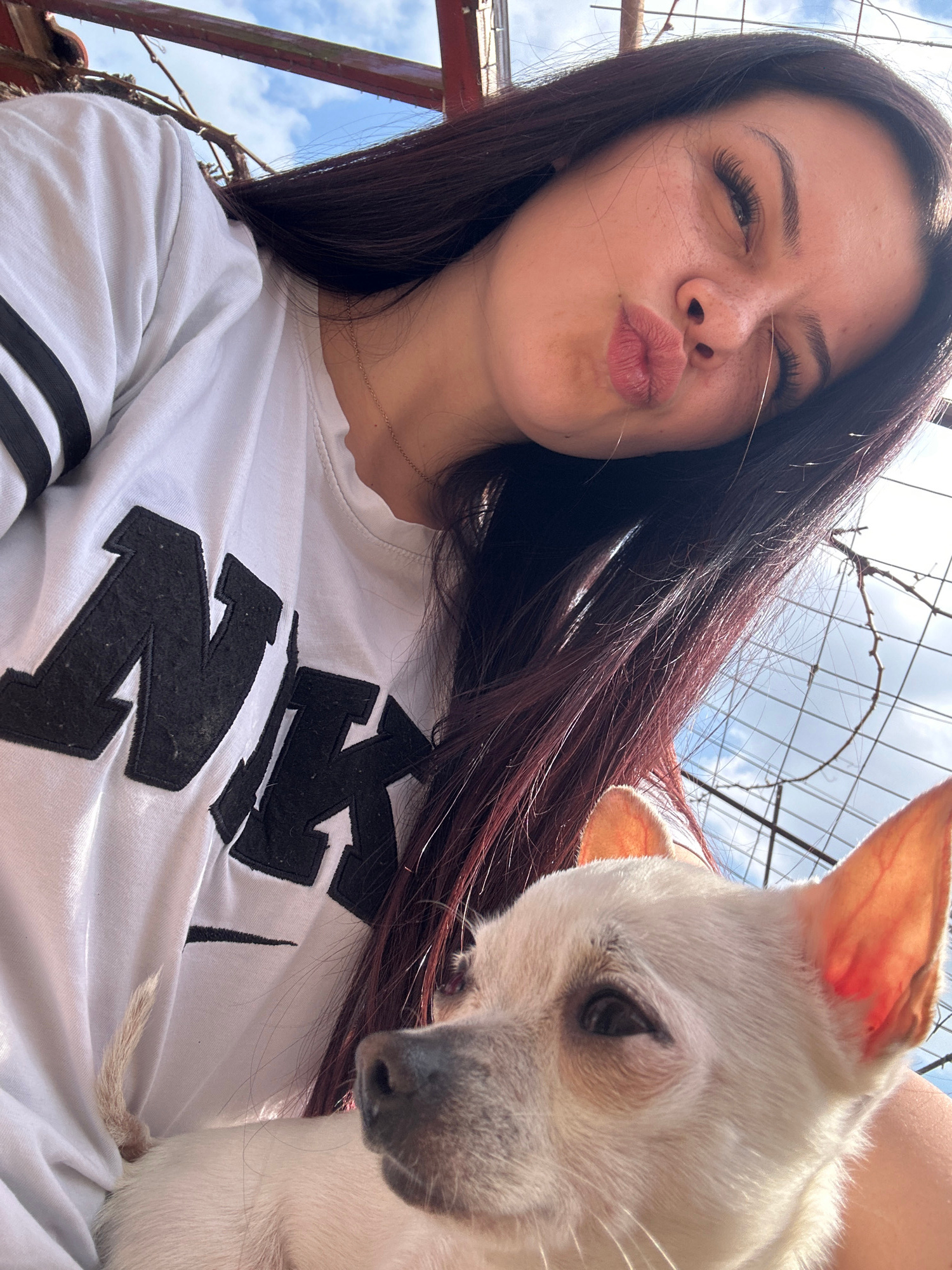 A woman with dark hair and freckles is posing for a selfie with a small, white dog. The woman is wearing a white t-shirt with a black logo on the front and is puckering her lips. The dog is nestled in…read more