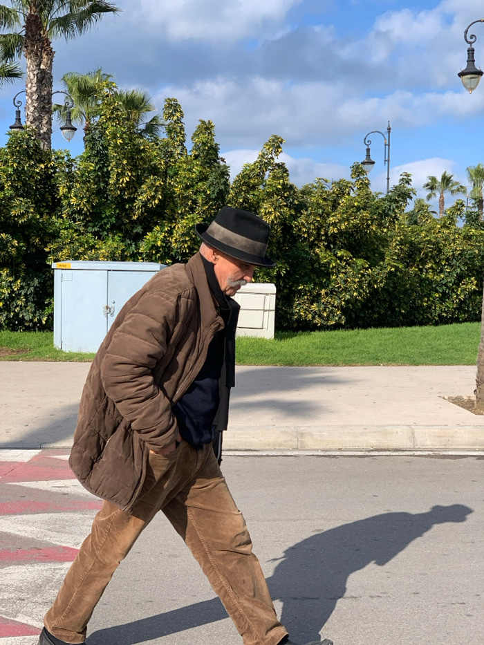 The image captures an adult male walking across a paved surface in Tangier, Morocco. The man, appearing middle-aged with a graying mustache, wears a black fedora with a beige band, a brown quilted pufβ¦read more