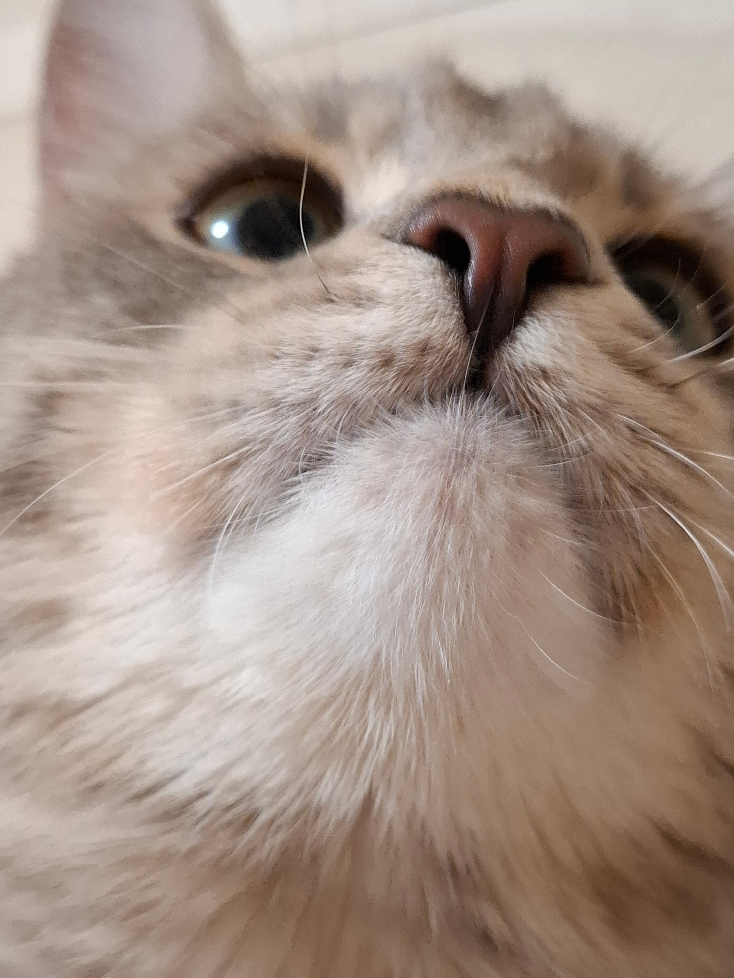 A close-up photograph shows a cat's face. The cat has brown eyes and a pink nose. The cat is looking up at the camera. The cat's fur is light brown and white. The location is not identifiable as Novi…read more