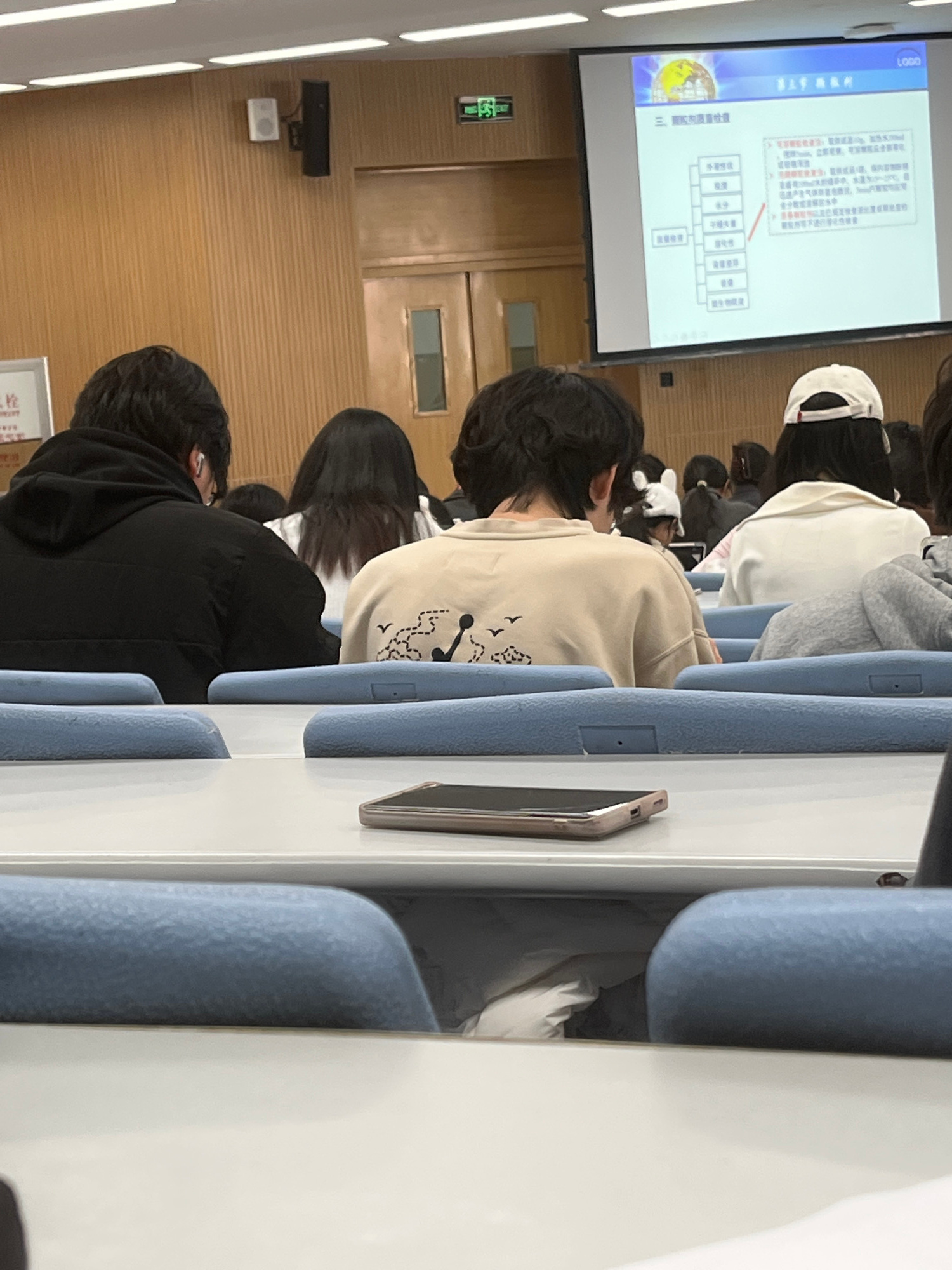 Here is a description of the image: The image depicts a classroom setting in Changchun City, China. A group of students are seated at desks, facing forward. A projector screen displays text in Chines…read more
