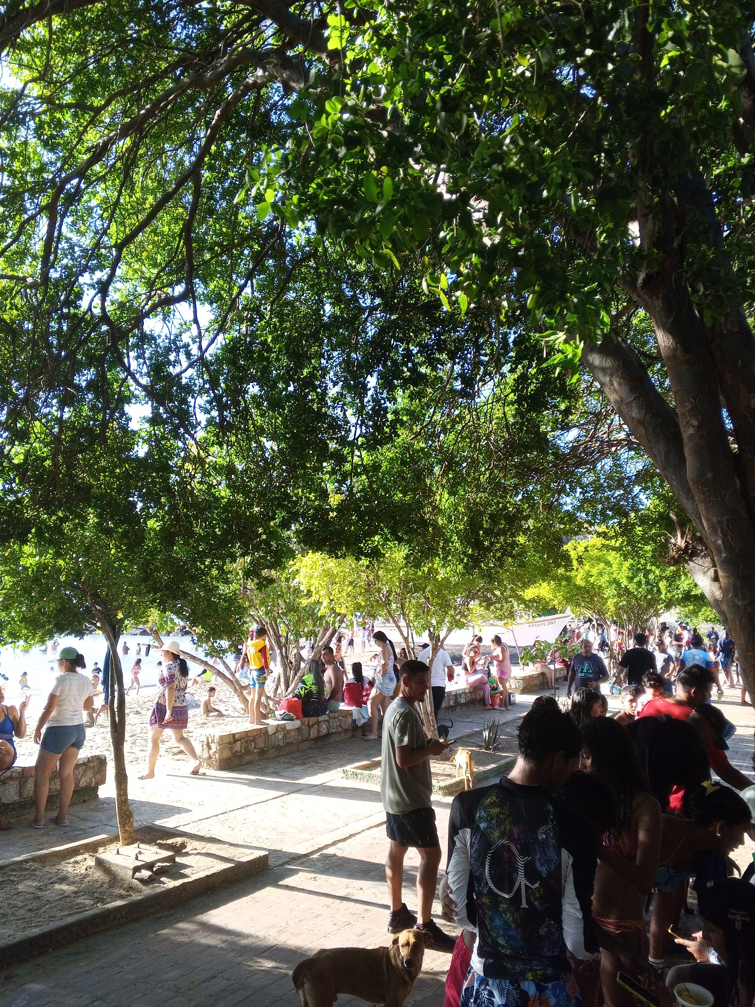 This outdoor scene depicts a crowded beach area in Pedro González, Venezuela. A variety of people are present, with some walking along the shore while others are gathered under the shade of large tree…read more