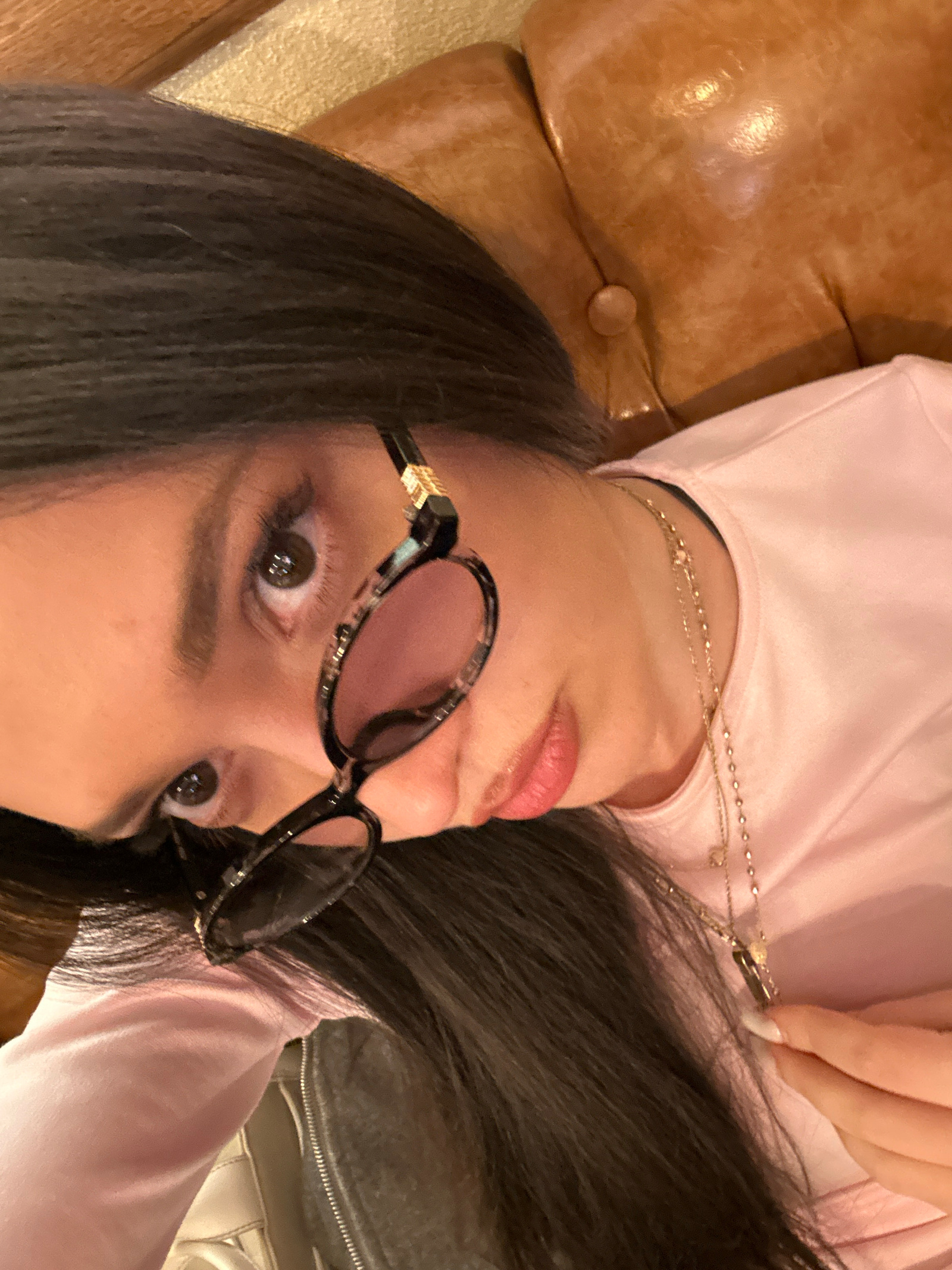 A woman lies on a brown leather couch, her head tilted back. She wears a pink shirt and a gold necklace. Dark hair frames her face. She sports sunglasses with patterned rims and pink lenses. One hand…read more