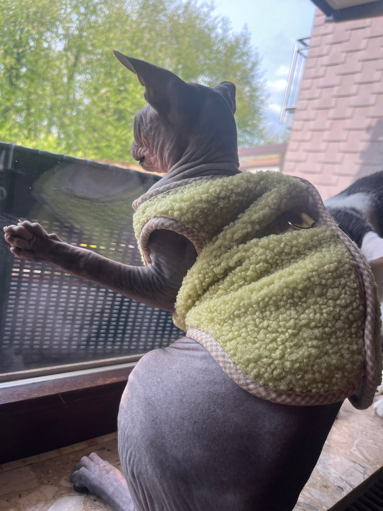 A Sphynx cat, wearing a light green, fuzzy jacket with a beige checkered trim, is perched on a window sill. The cat is looking outside, its paw resting on the glass. Through the window, blurred trees…read more