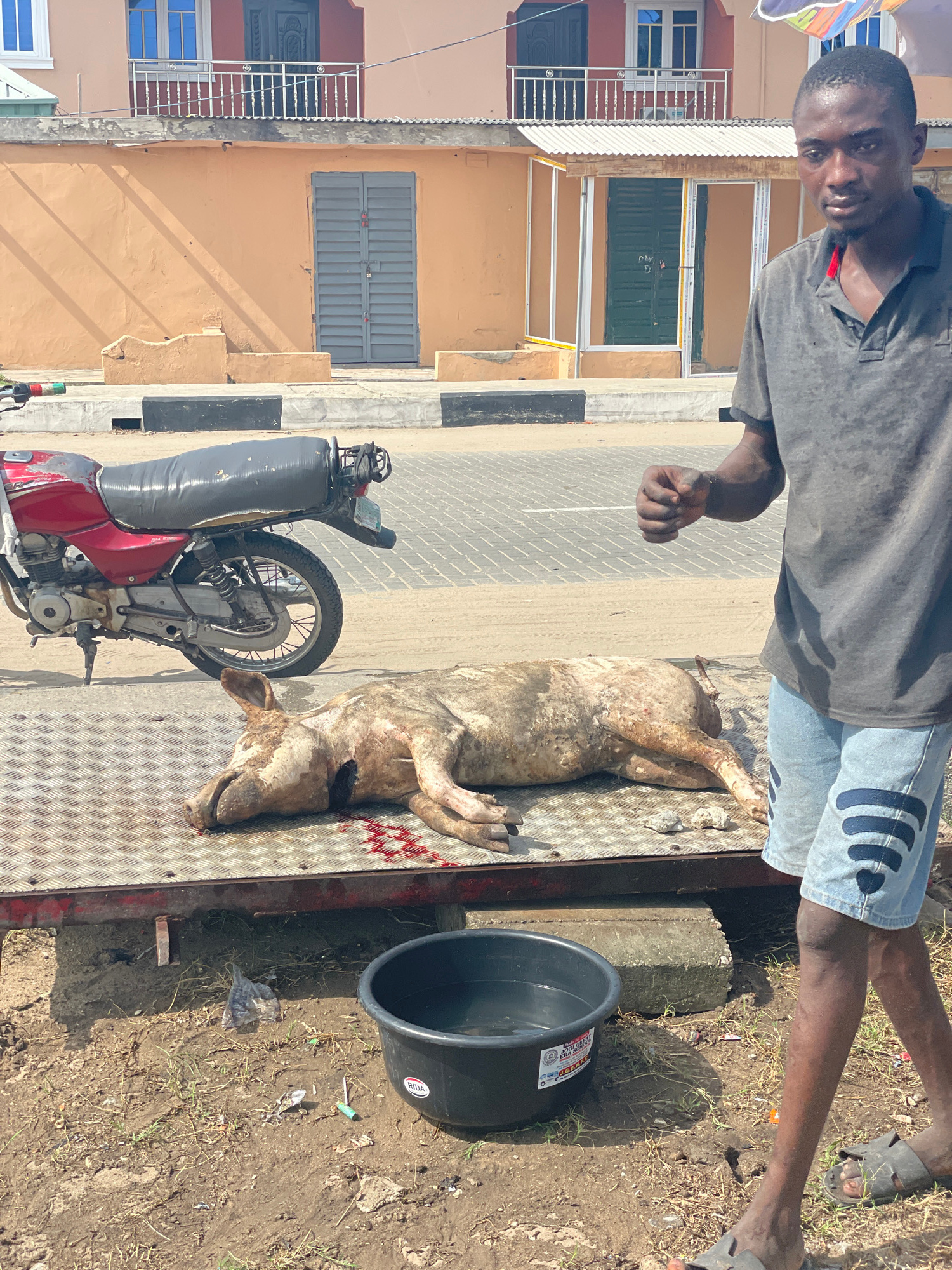 The image captures an outdoor scene in what appears to be a sunny, urban or semi-urban environment, consistent with Badagry, Nigeria. The primary subject is a dark-skinned man standing upright, facin…read more