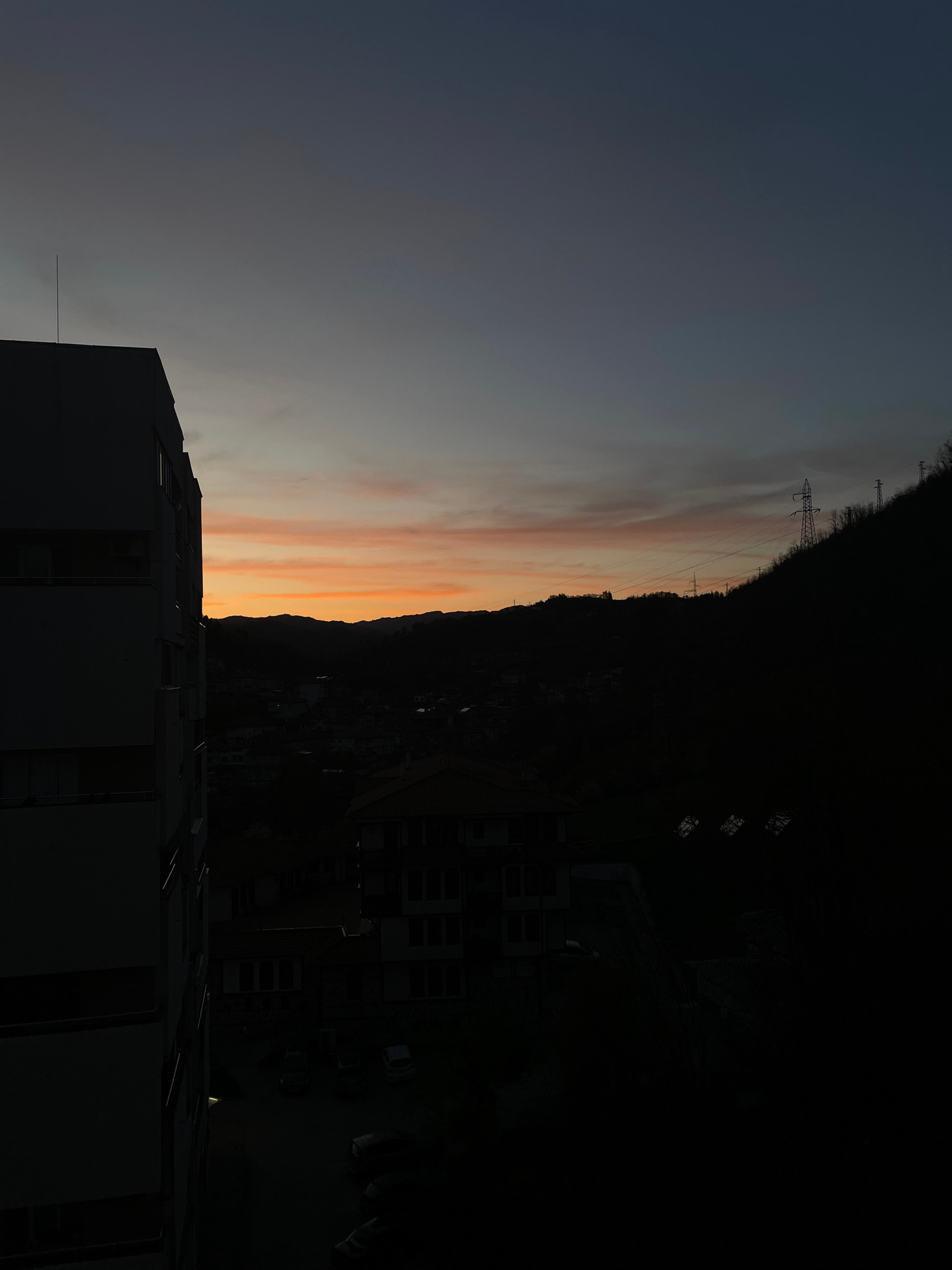 The image shows an evening scene from a high-rise building in Zlatograd, Bulgaria. A large residential or commercial building is visible at the bottom of the frame. Beyond the building, there is a sky…read more
