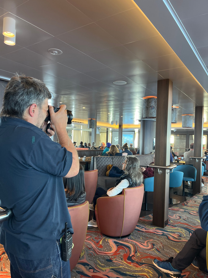 A man with graying hair is taking a picture with a camera in a room with a crowd of people. He's wearing a navy blue shirt and jeans, with a walkie-talkie clipped to his waistband. The room has unique…read more