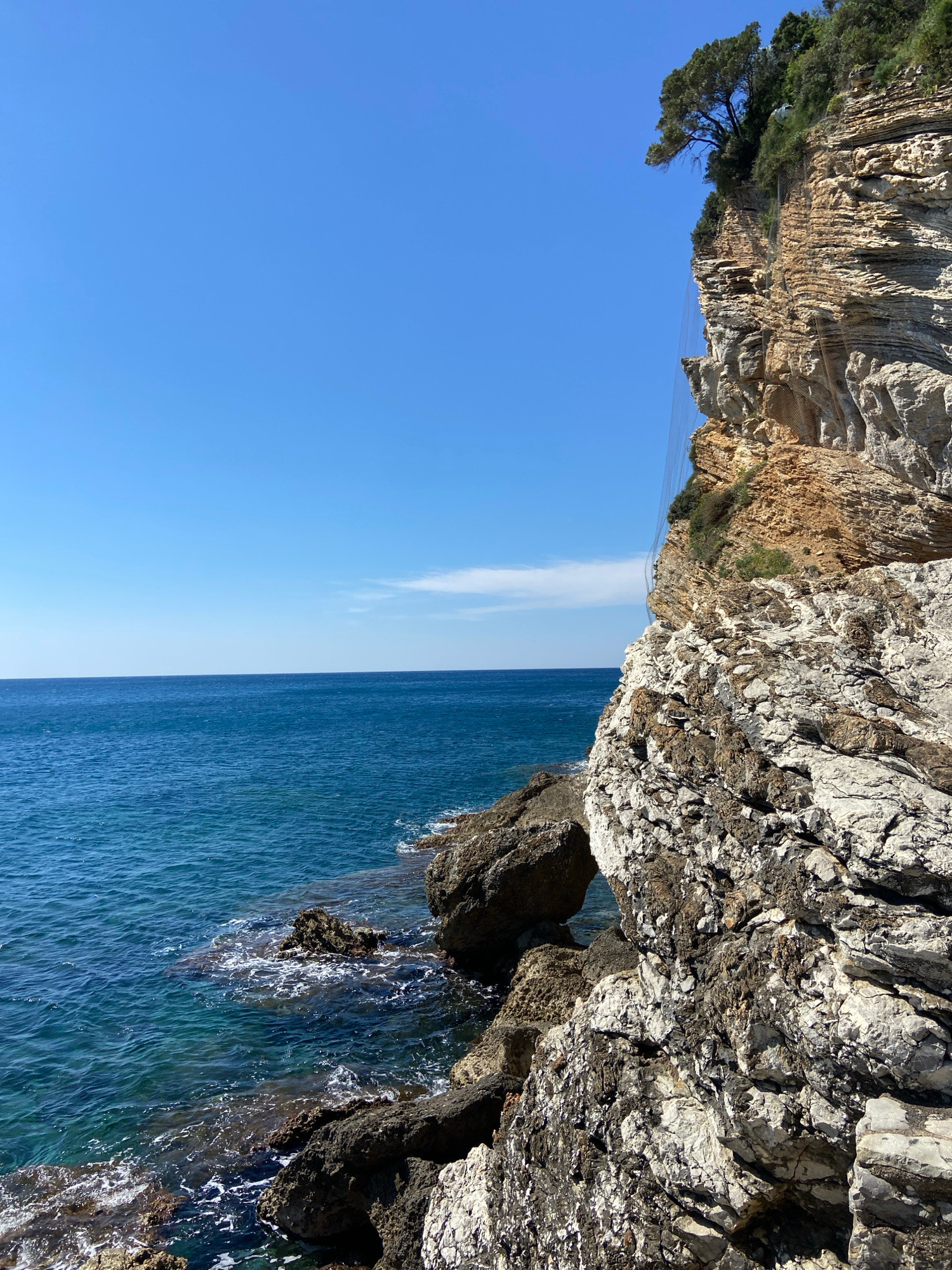 The image depicts a coastal scene in Budva, Montenegro, showing a rocky cliff formation meeting the Adriatic Sea. The cliff on the right is textured, with visible rocks and water washing at the base.…read more