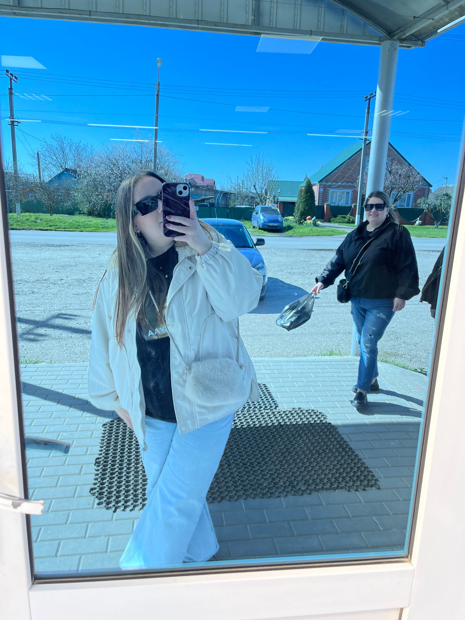 A photo shows a reflection in a glass window. A woman in a light-colored jacket and jeans is taking a picture of herself with a cell phone. Reflected in the background is a street scene in Novopokrovs…read more