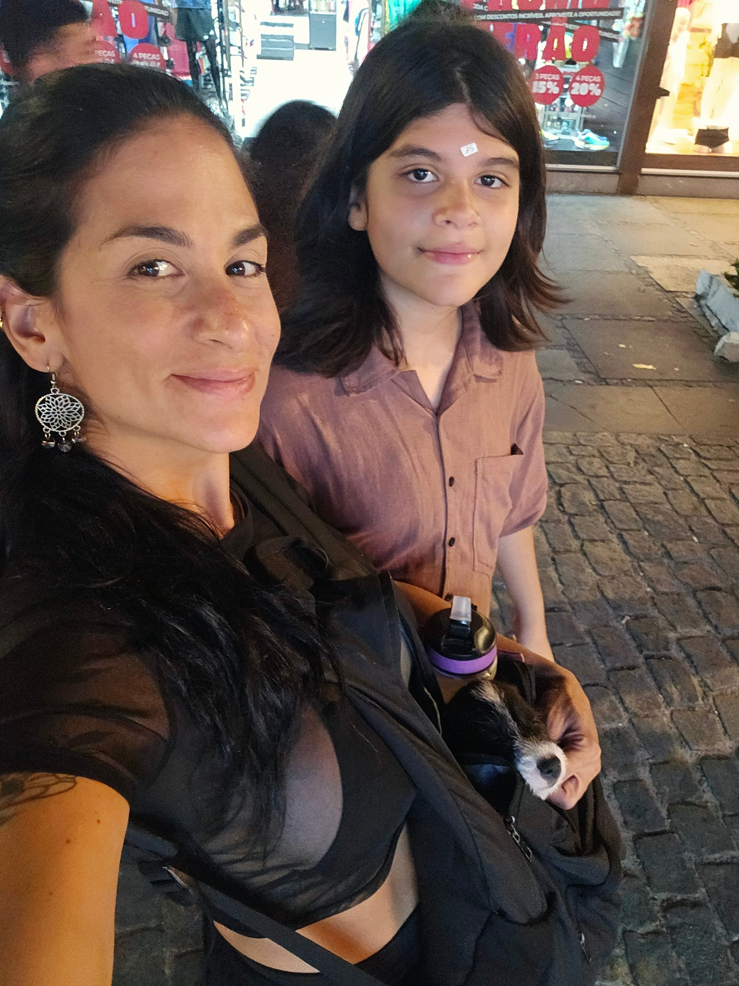 Two women are in a self-portrait photo on a cobblestone street in Armação Dos Búzios, Brazil. The woman in the foreground wears a black shirt with mesh elements and large circular earrings. She carrie…read more
