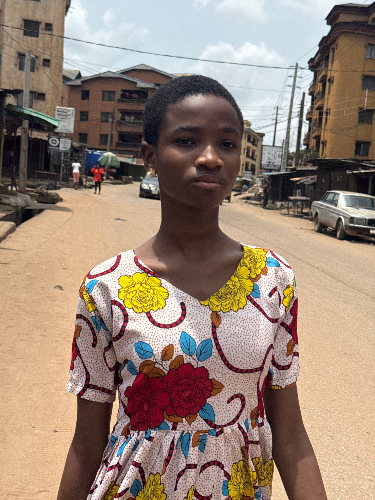 A young woman with short, dark hair stands facing the camera in what appears to be Onitsha, Nigeria. She is wearing a floral dress with red, yellow, and blue flowers on a white background. The street…read more