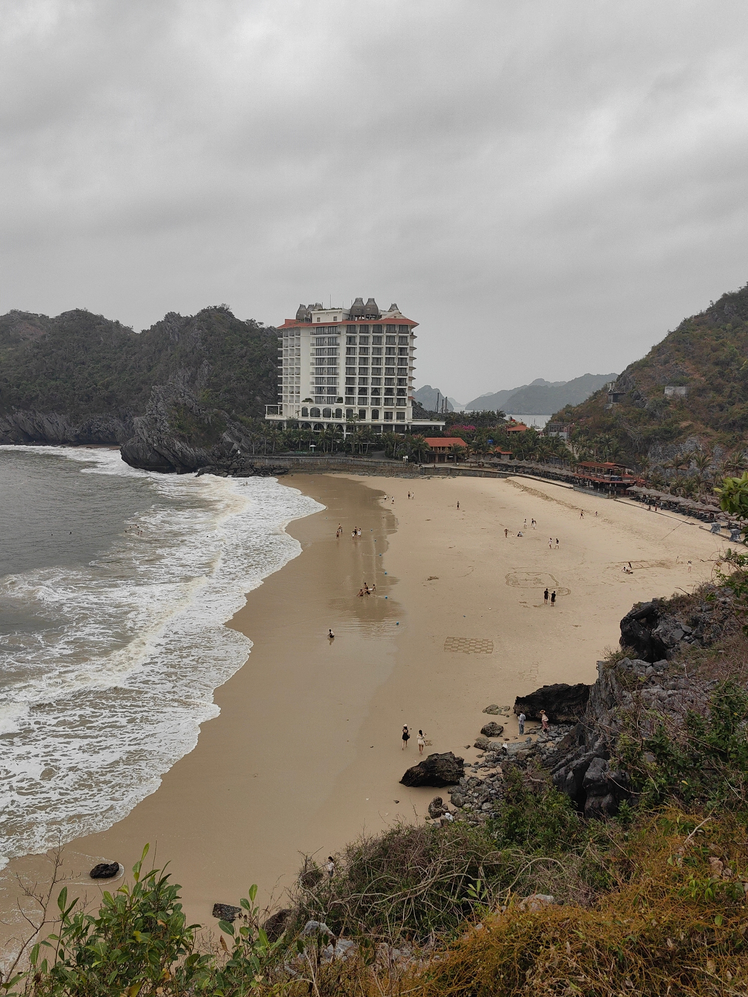 Captured from an elevated vantage point, the image showcases a beach scene in the city of Hải Phòng, Vietnam. A wide sandy beach stretches across the frame, lined by the ocean on one side and building…read more