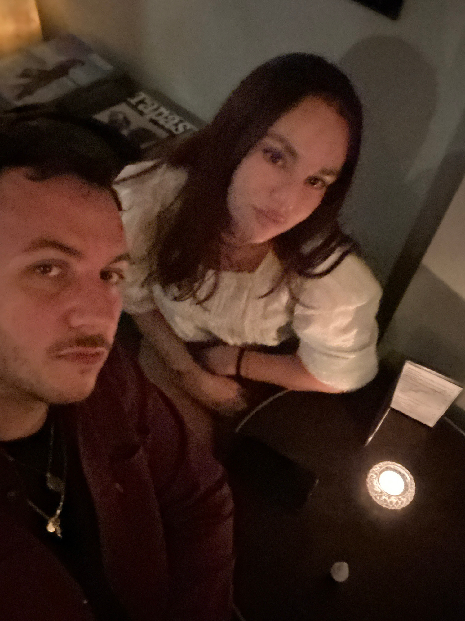 A low-angle, slightly blurred selfie captured inside a dimly lit establishment. Two people are visible: a woman with long, dark hair wearing a white, textured top, and a man with short hair wearing a…read more
