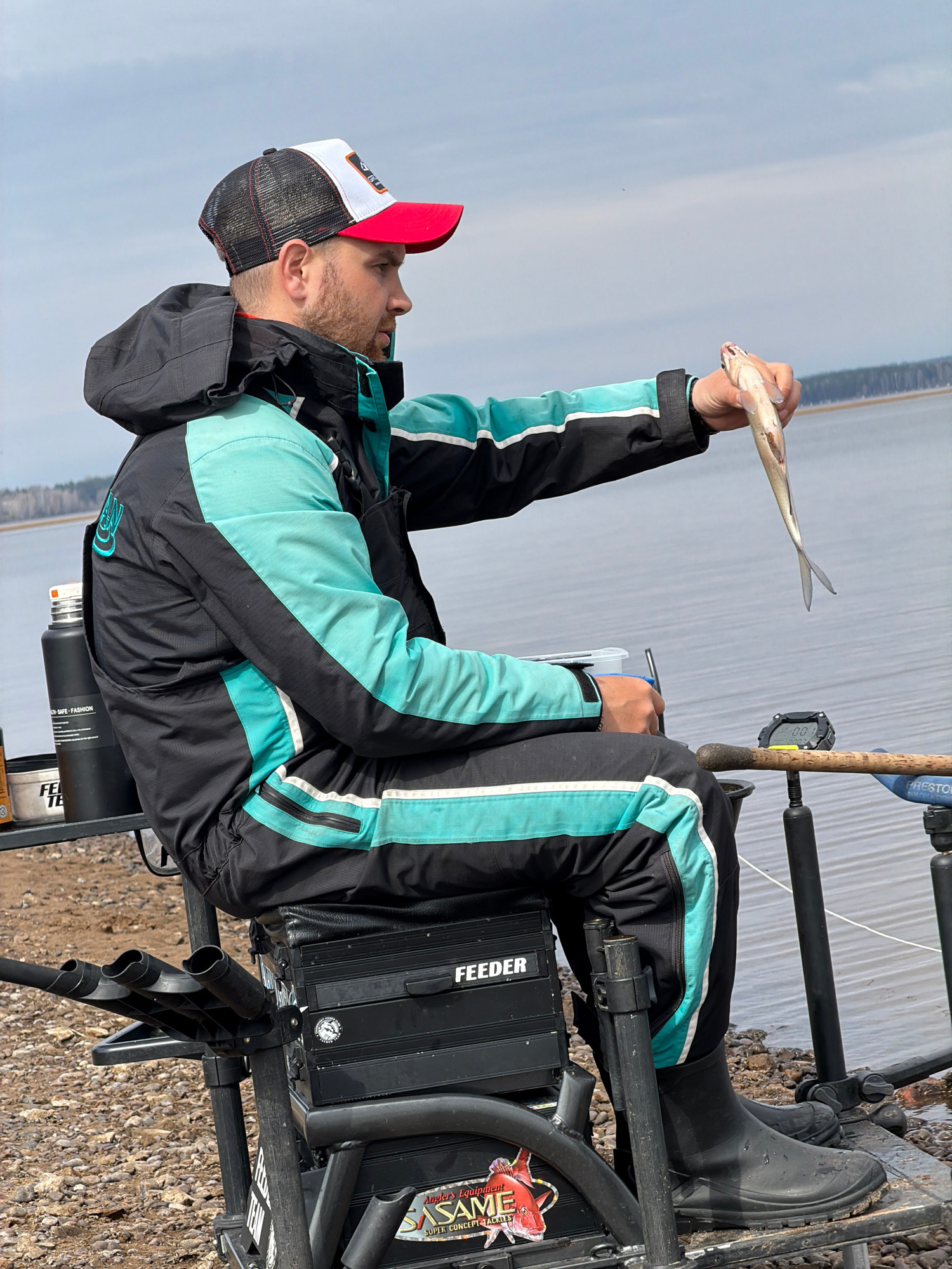A man is seated in a fishing chair on the shore of a body of water, holding a small fish up in the air. The man is wearing a black jacket with light blue accents, black trousers with similar accents,…read more