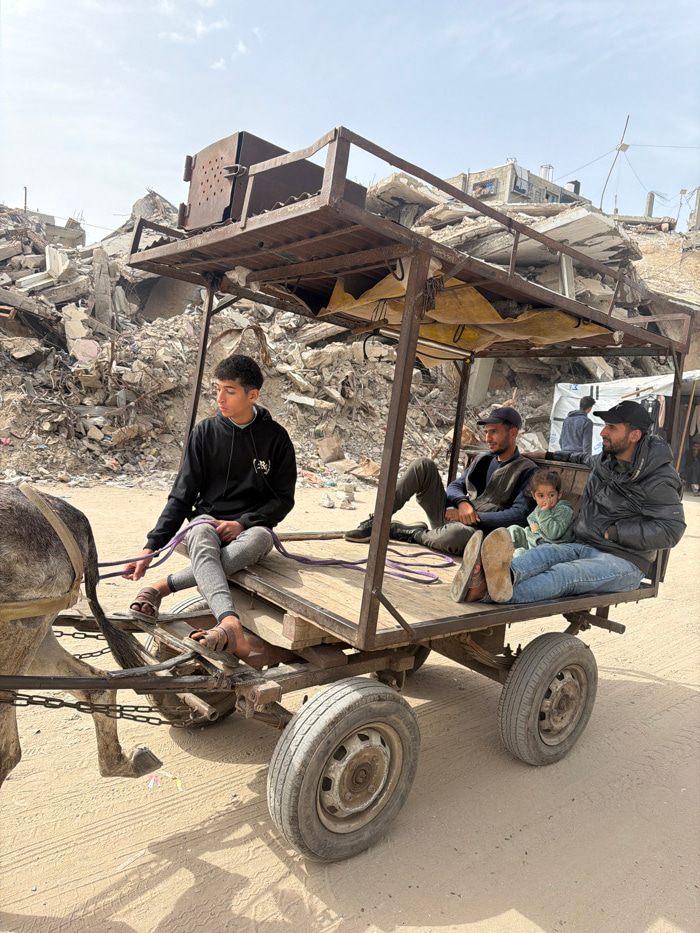 A horse-drawn wooden cart, fitted with a metal frame canopy and a rusted metal box, transports four individuals across a dirt road in a heavily damaged urban area of Gaza City, Palestinian Territory.…read more