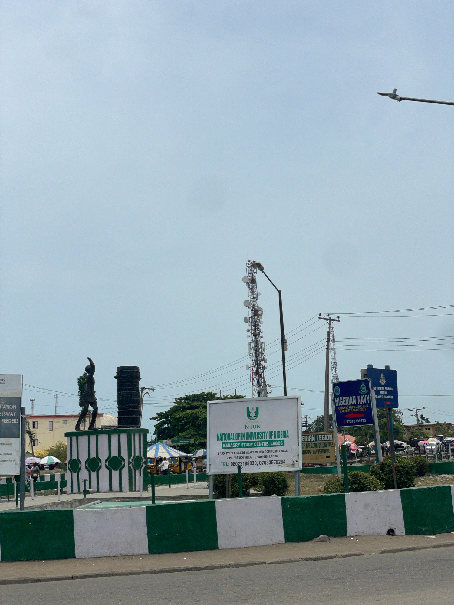 The image shows a street scene in Badagry, Nigeria. A green and white curb lines the road. Roadside signs are visible for the National Open University of Nigeria (NOUN), the Nigerian Legion, the Niger…read more