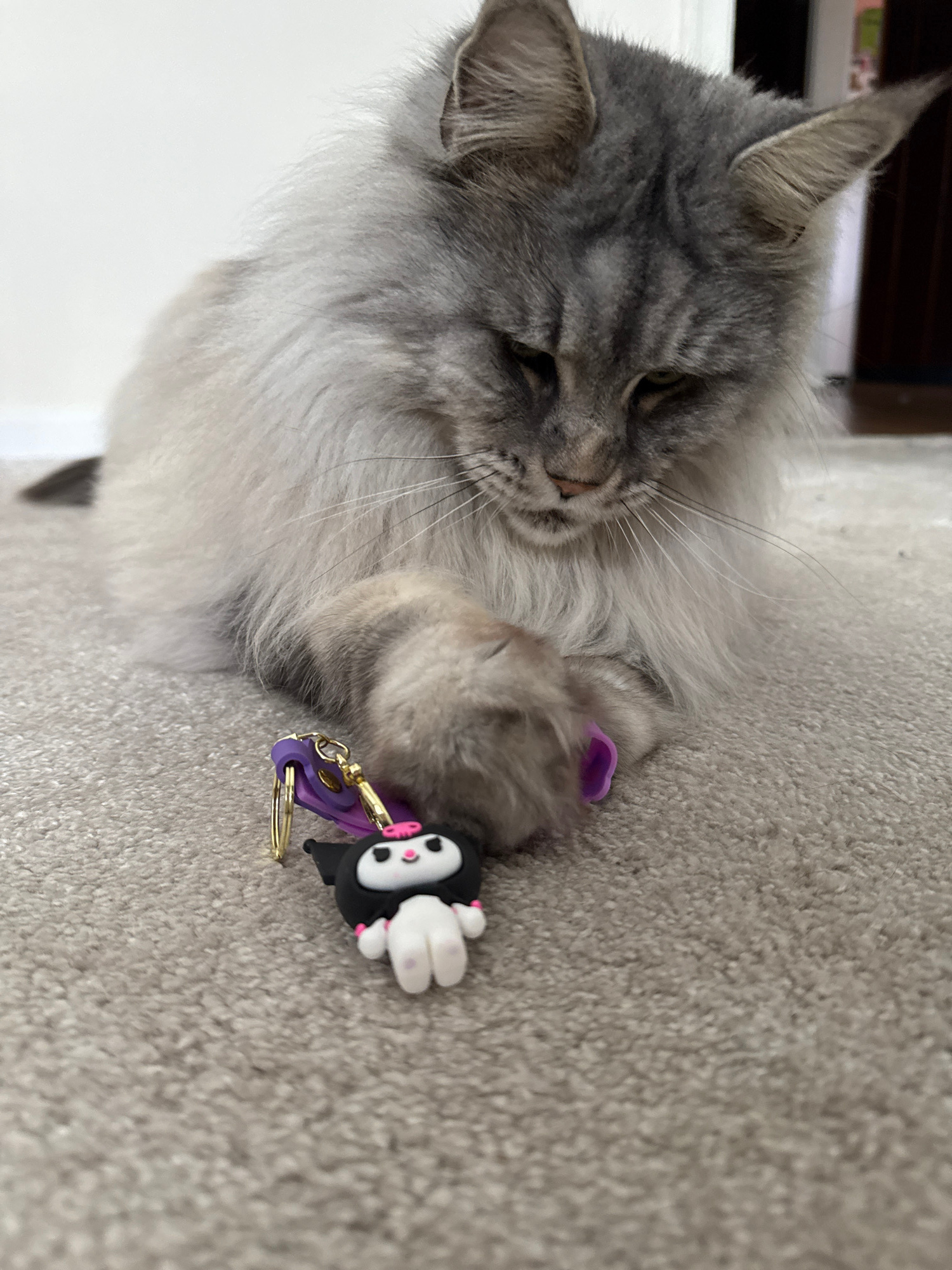 A fluffy, gray and white cat is lying on a light gray carpet, paws around a black and white cartoon character keychain with purple accents and gold rings. The cat appears to be resting its head on the…read more