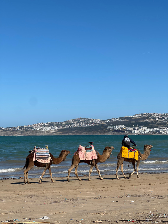 A line of camels with riders walks along a beach bordering a body of water. The camels are adorned with various colorful coverings. A town or city is visible on a hill in the background. The sand is l…read more