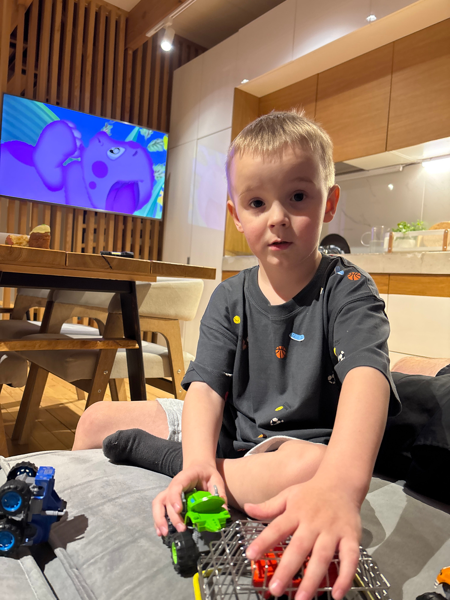 A boy with blond hair is sitting and playing with toy cars. He is wearing a dark t-shirt with sports-themed graphics and grey shorts. He has one sock on. There is a cage-like container filled with toy…read more
