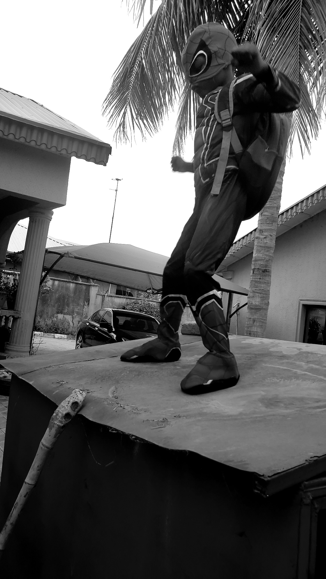A person in a Spider-Man costume stands on a rooftop near Sabon Tasha, Nigeria. The person is wearing boots with a white design on the legs. They have a backpack on. Palm fronds are visible in the topβ¦read more