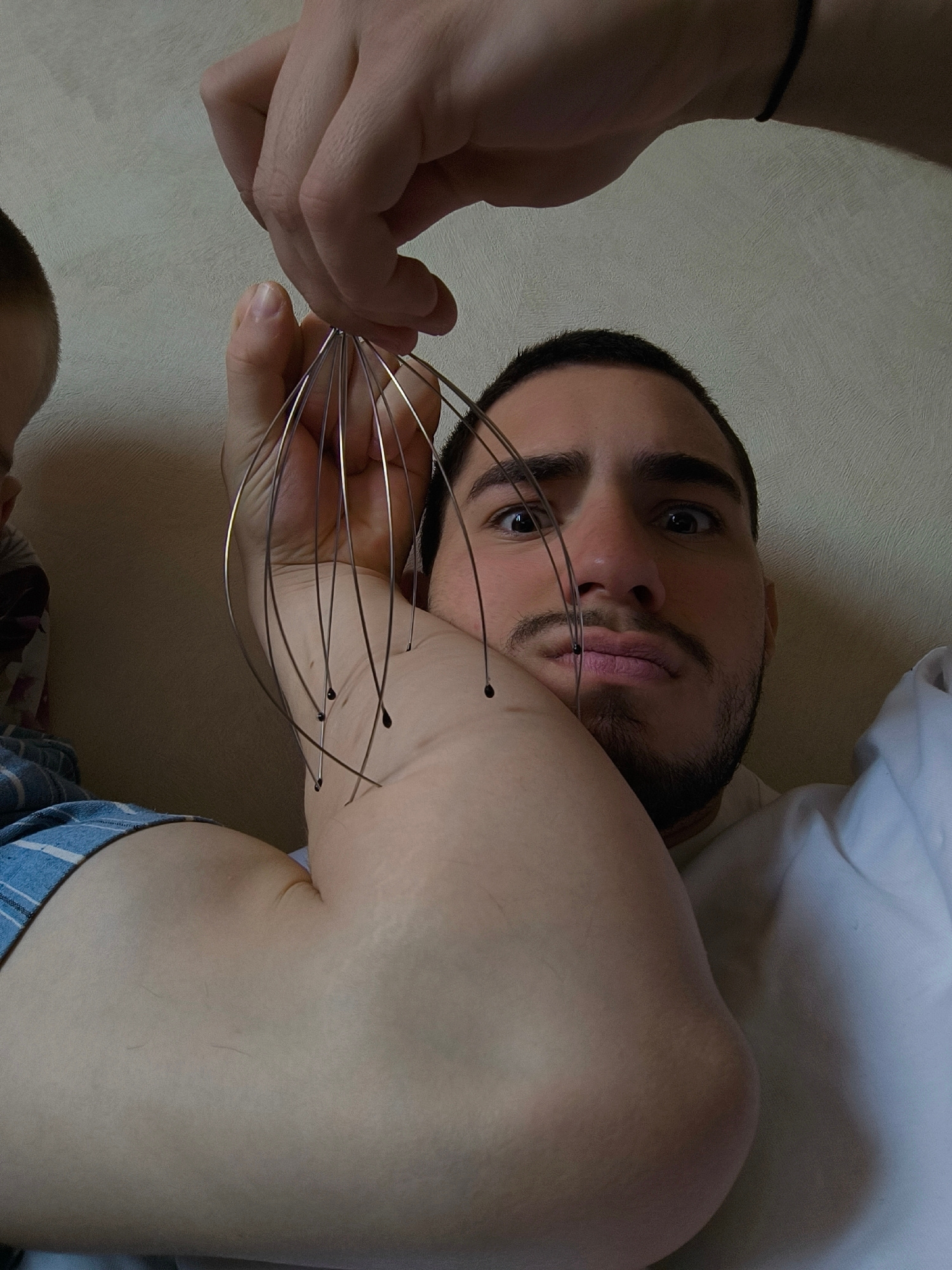 The image presents a close-up, low-angle shot featuring a young man and partially visible elements of another individual, likely a child. The primary subject, a young man with dark hair, a beard, and…read more