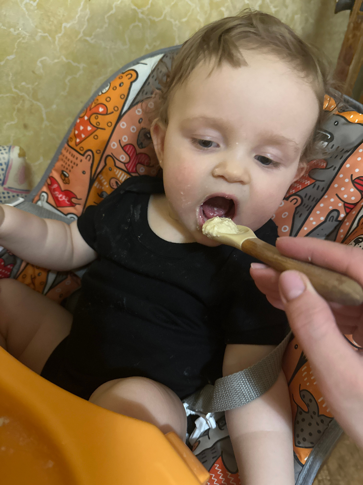 A baby is being fed a spoonful of food while sitting in a highchair. The baby has light skin, light brown hair, and is wearing a black onesie. An adult's hand holds a wooden spoon with yellow food in…read more