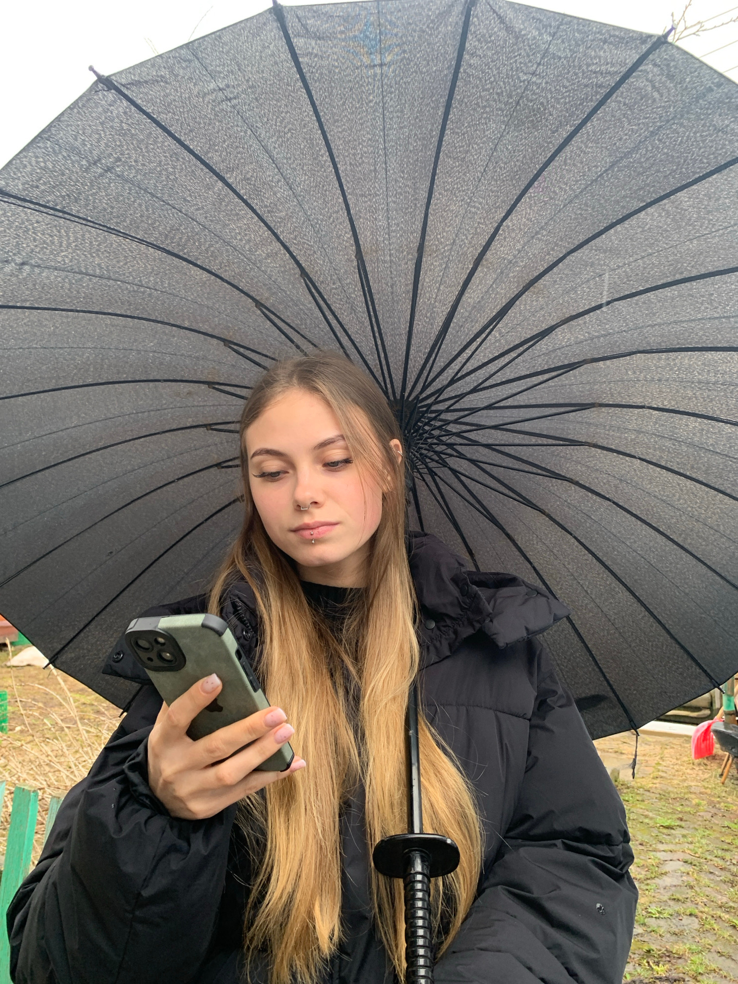 A young woman with long blonde hair is holding a smartphone in her right hand under a large black umbrella. The woman has fair skin, closed eyes, and piercings on her lip and nostril. She is wearing a…read more