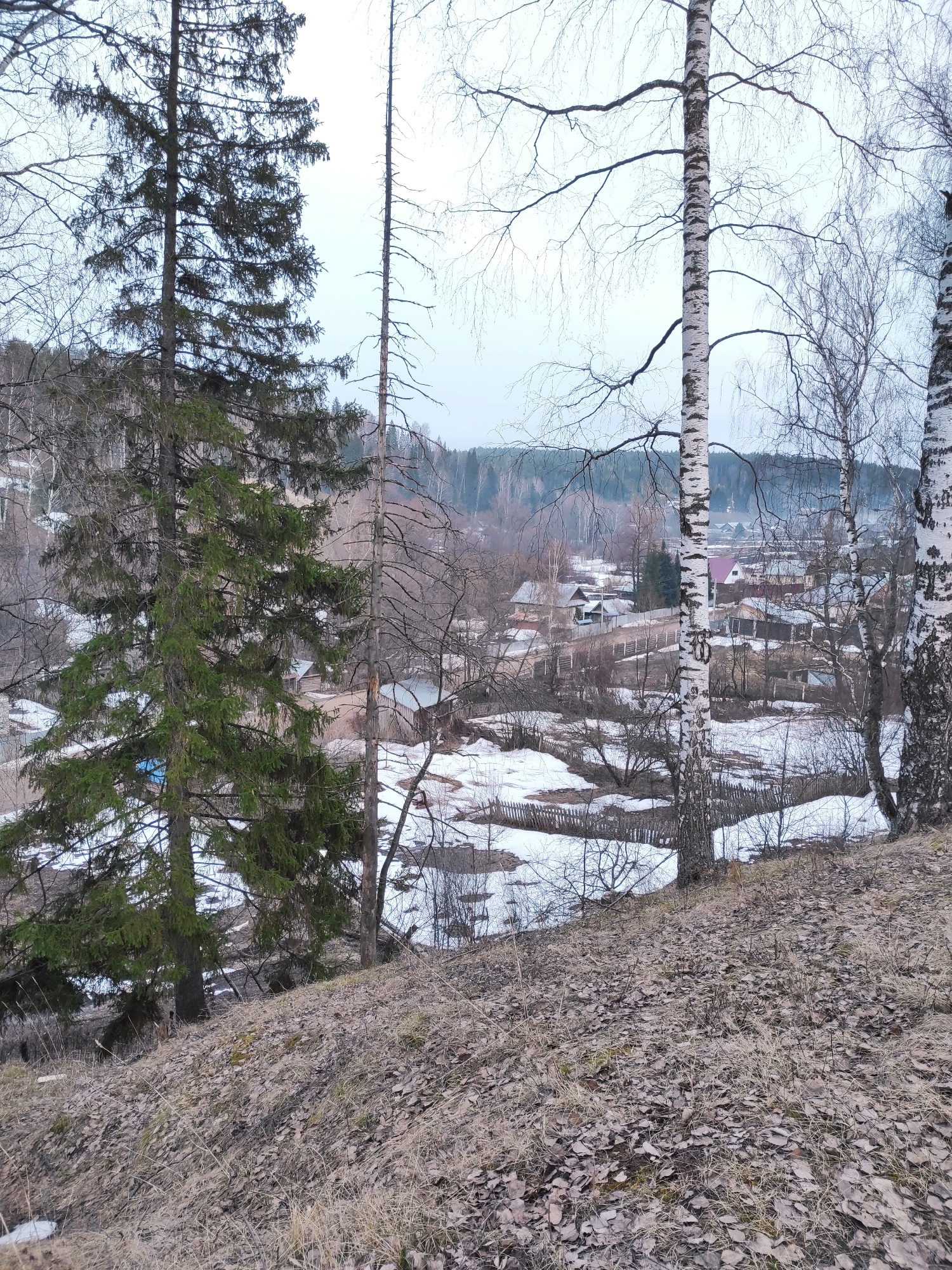 The image shows a view of a village in Ольховка, Russia, through a sparse forest. There are birch trees and evergreen trees visible, with a ground cover of dry leaves and grass. Buildings are visible…read more