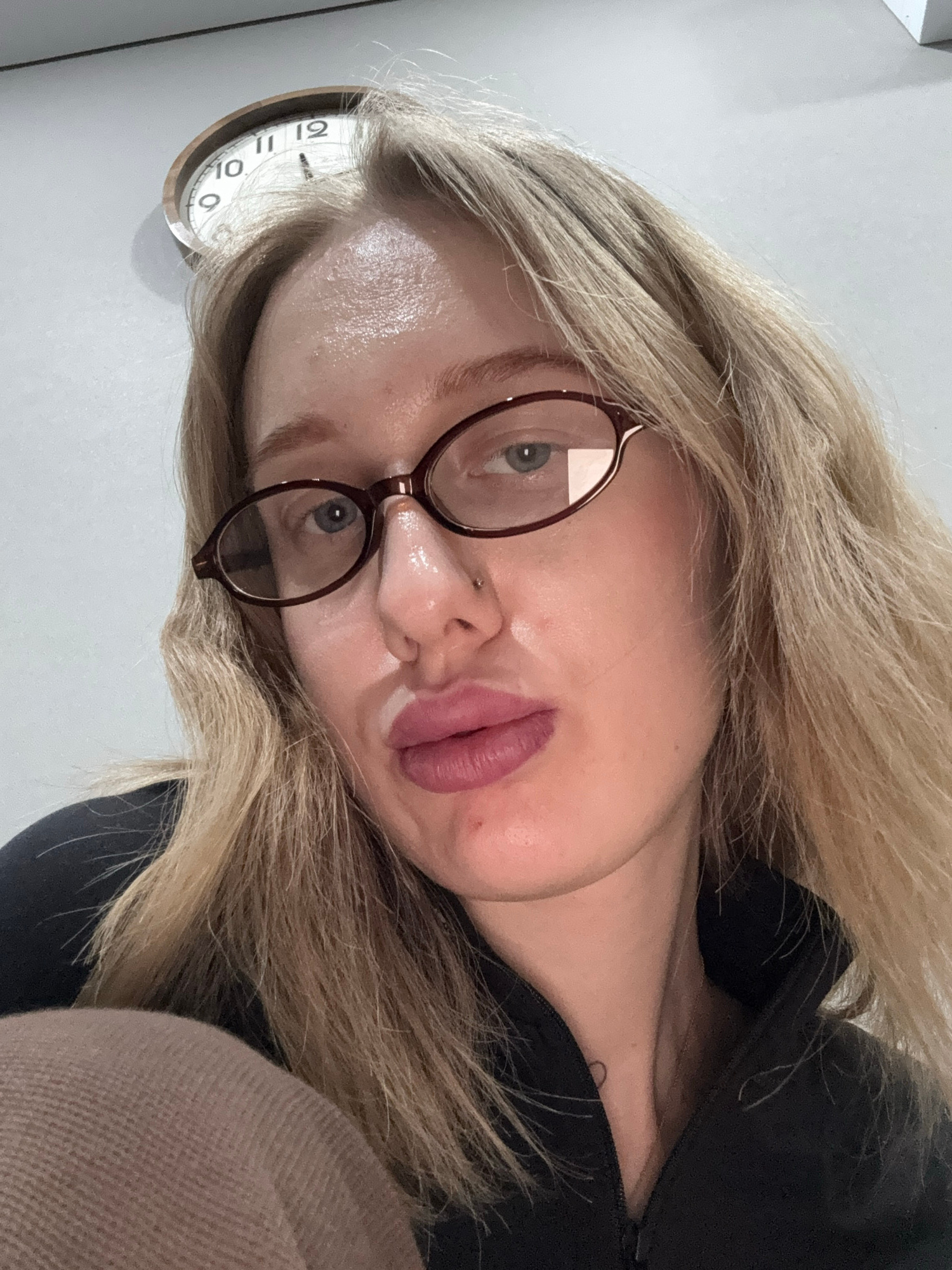 A selfie-style photograph features a blonde woman wearing eyeglasses. A portion of a clock is visible in the background. There is no information to determine a location in Kuleshovka, Russia.