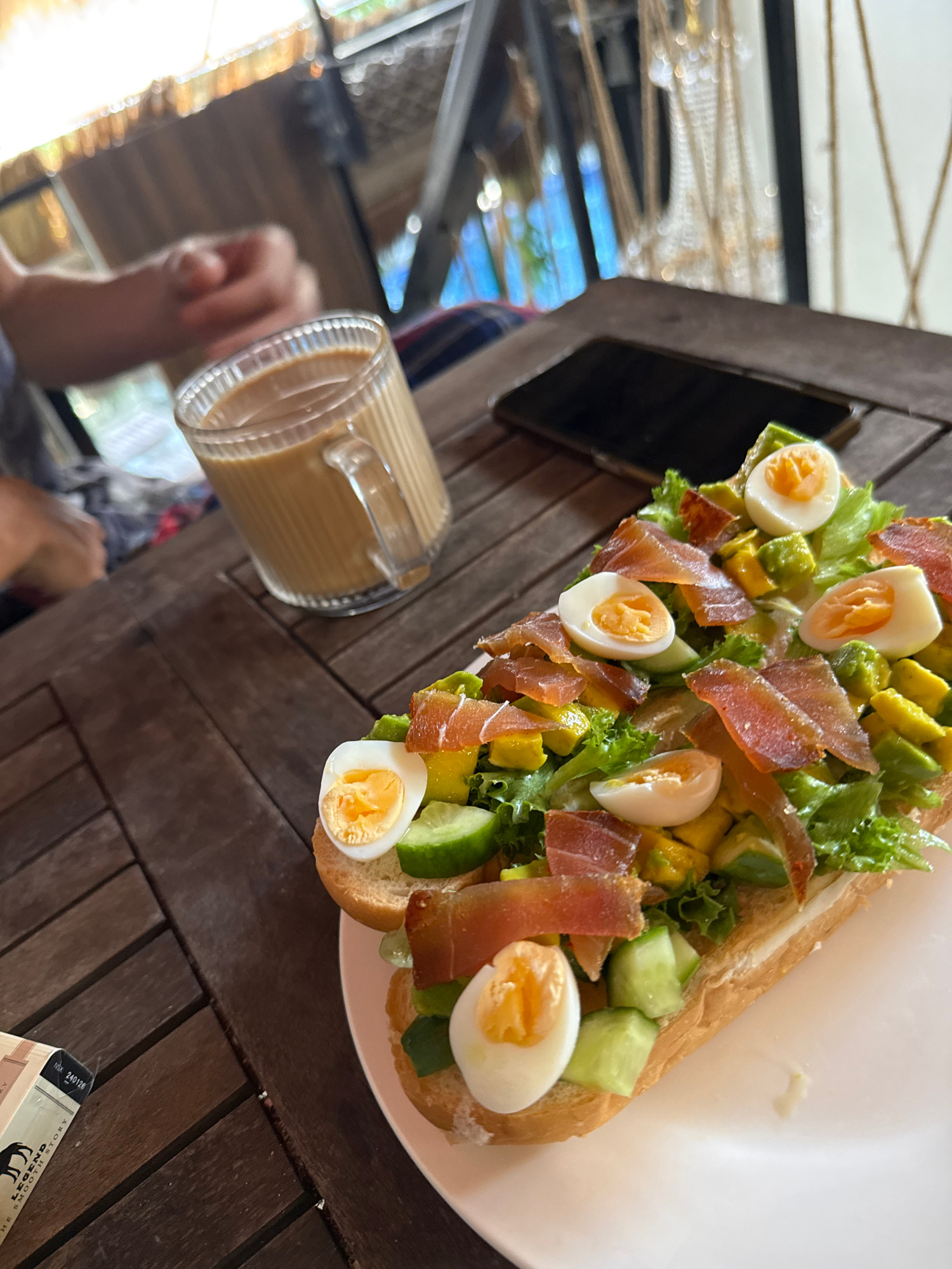 A close-up, angled shot captures a meal and drink on a wooden table in what appears to be a restaurant setting in Bac Natural Heritage Area Trang, Vietnam. A sandwich, topped with lettuce, avocado, bo…read more