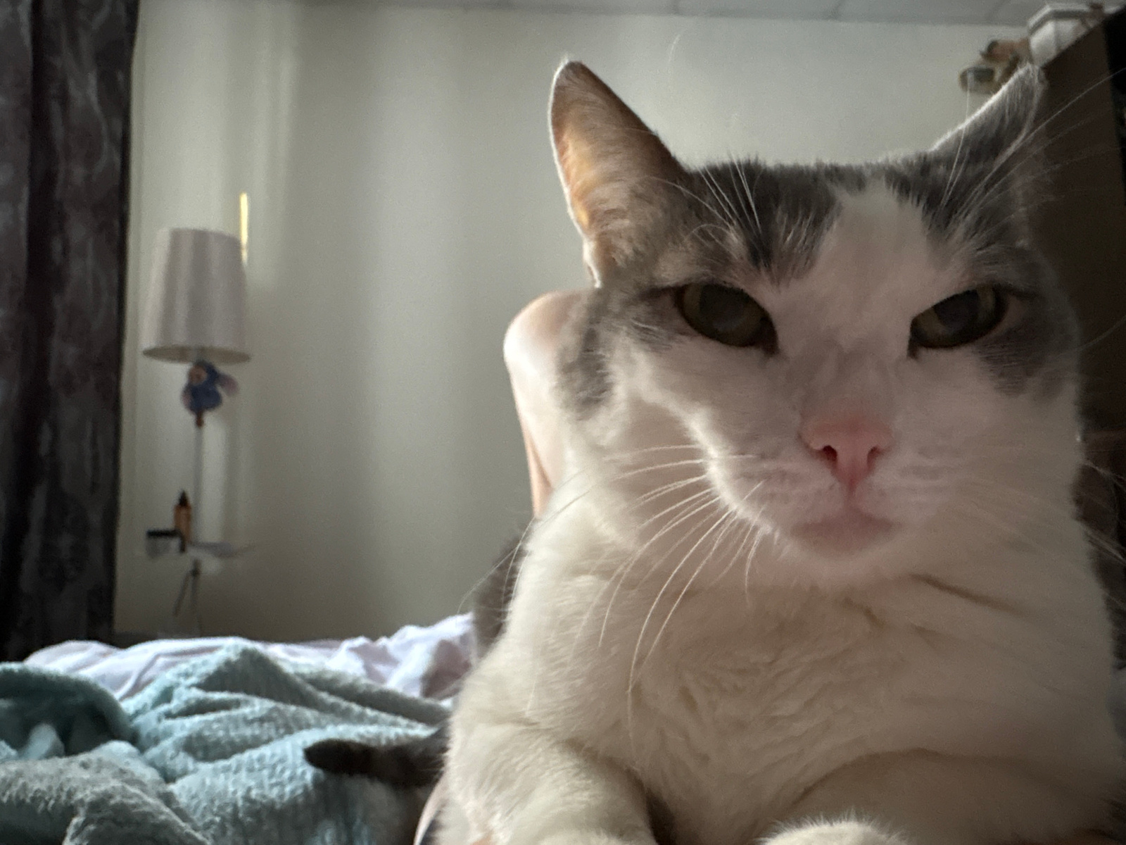A close-up shot shows a cat with white fur and gray markings on its head and ears. The cat has green eyes and a pink nose, and its whiskers are visible. The cat is sitting on a bed covered with a text…read more