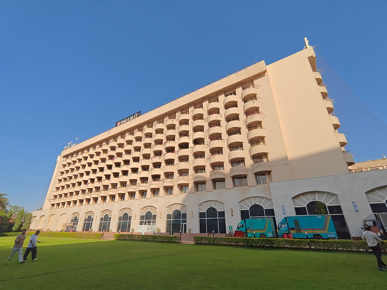 A medium-wide shot depicts the Lalit Hotel in Mumbai, India, under a clear blue sky. The cream-colored building, with numerous balconies, extends towards the upper right corner. A sign reading "THE LA…read more