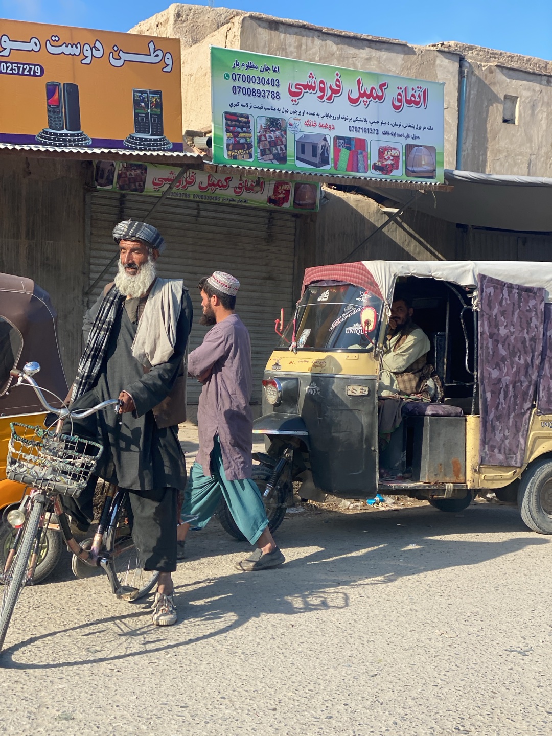 The image captures a street scene in Kandahar, Afghanistan. Two men in traditional attire are positioned near a bicycle on the left side of the frame. Adjacent to them is a three-wheeled vehicle, alsoβ¦read more