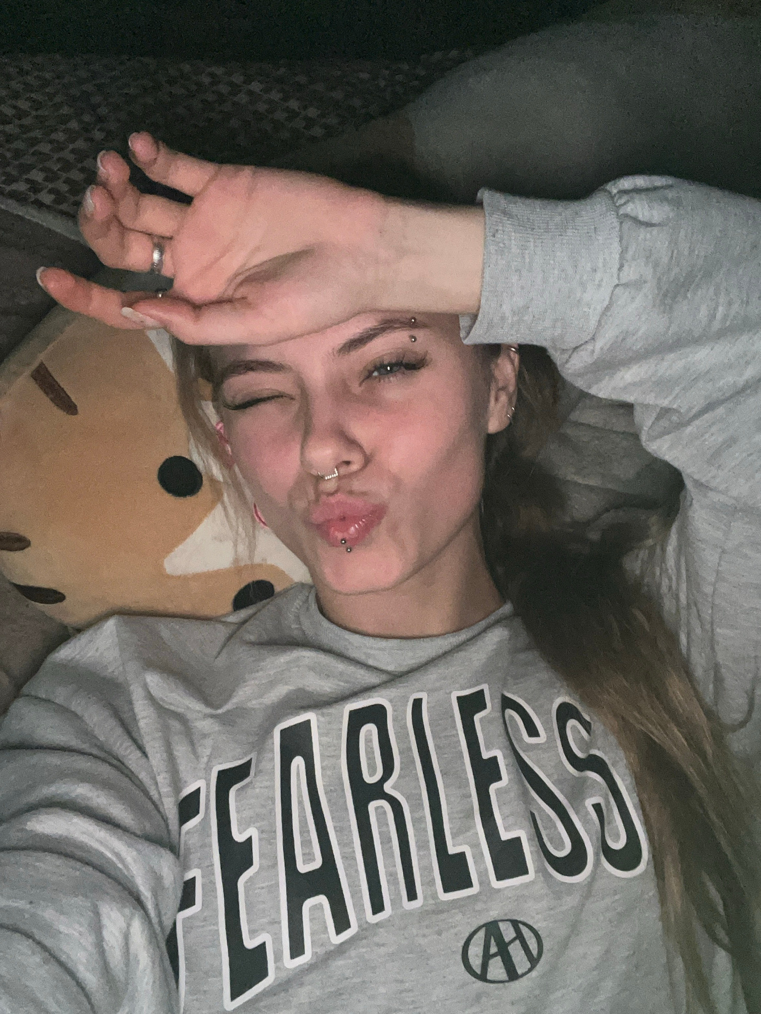 A young woman with multiple piercings (eyebrow, nose, lip, ear) is lying down, her face partially obscured by her hand. She is wearing a gray sweatshirt with the word "FEARLESS" printed in bold, black…read more