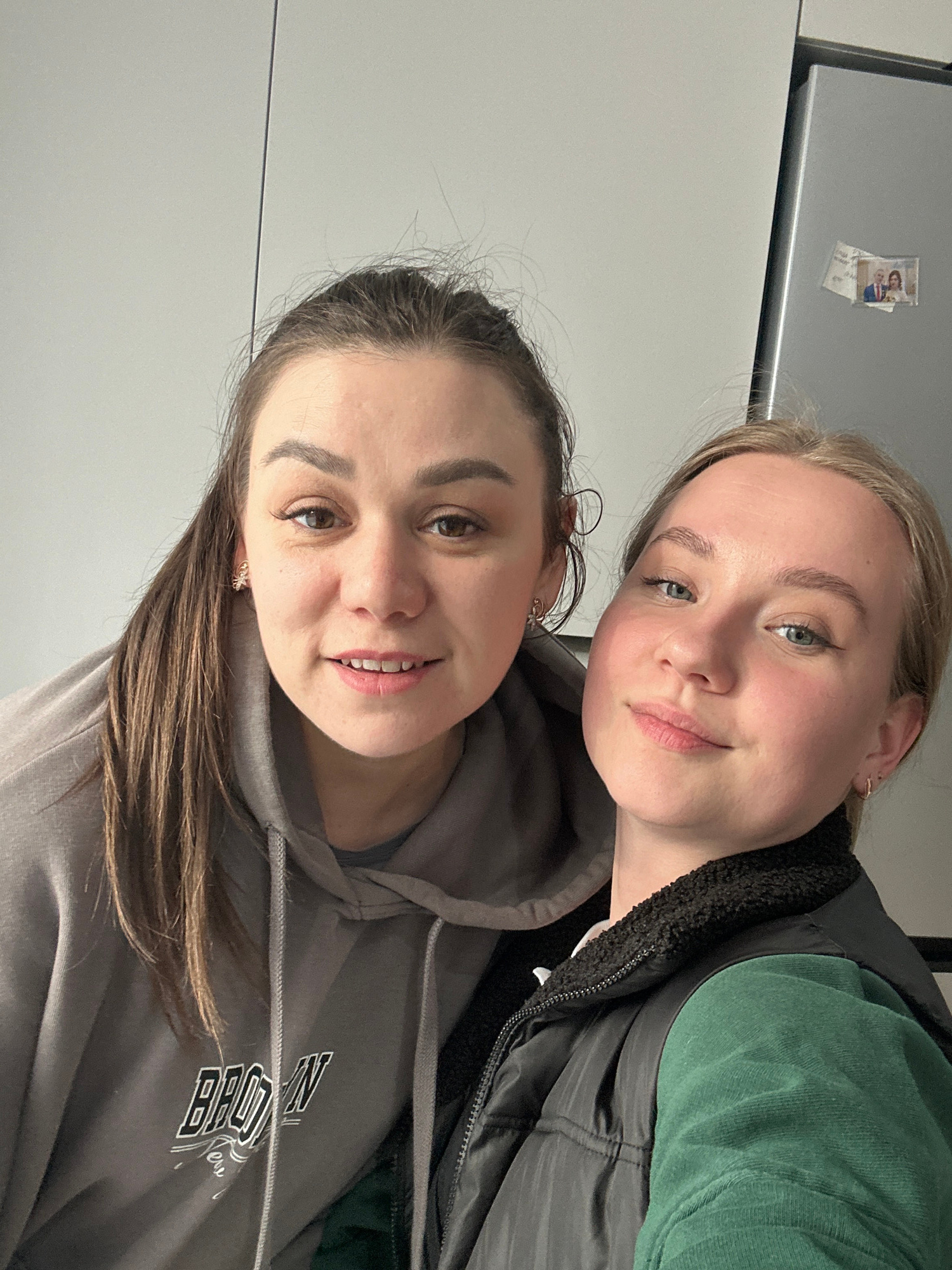 Two young women are captured in a casual, close-up indoor selfie, both smiling at the camera. In the foreground, a woman with medium-brown hair, styled down, has dark eyes and is smiling. She is wear…read more